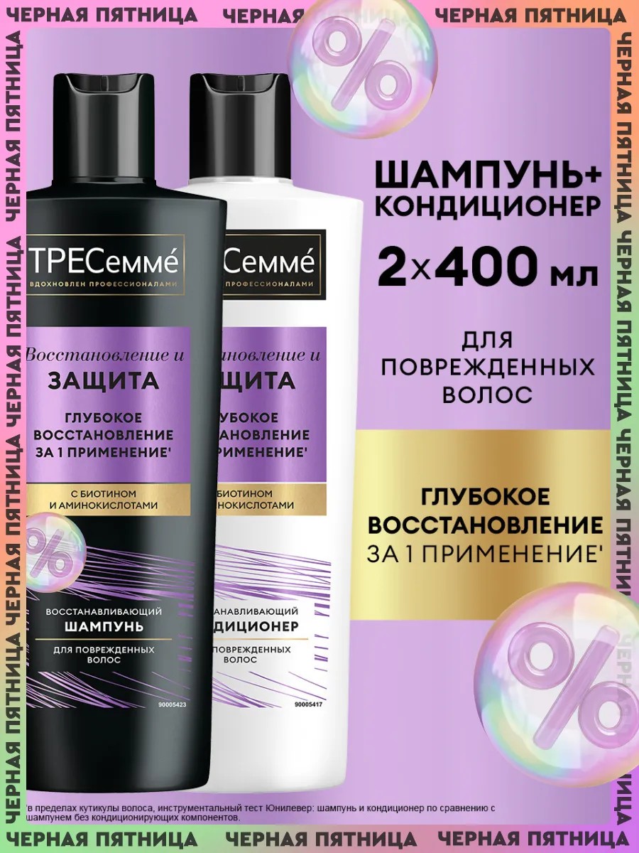 ТРЕСеммé Восстановление и Защита — шампунь и кондиционер восстанавливающие для волос, обогащенные биотином и аминокислотами. Шампунь и кондиционер оказывают помощь для безжизненных волос: 1. Шампунь и кондиционер женский преображают ломкие и истонченные волосы за одно применение*. 2. Особая** формула с биотином и аминокислотами для волос работает с каждым волосом, восстанавливая и питая его изнутри, и дает видимый результат даже после сильных повреждений. 3. Шампунь и кондиционер для поврежденных волос значительно сокращают количество секущихся кончиков*. Шампунь и кондиционер с биотином и аминокислотами ТРЕСеммé Восстановление и Защита идеально подойдут для ломких волос, которые потеряли жизненную силу из-за частых укладок феном и окрашиваний. Также шампунь и кондиционер для ломких волос можно применять для дополнительного питания локонов. Для достижения максимального эффекта используйте шампунь и кондиционер для поврежденных волос в комплексе с другими продуктами из линейки Восстановление и Защита. От создания безупречного образа вас отделяют три простых шага: 1. Очистите волосы и кожу головы шампунем для волос женским ТРЕСеммé. 2. Нанесите восстанавливающий кондиционер из коллекции Восстановление и Защита, который глубоко*** напитает волосы изнутри и сделает их менее ломкими. 3. Используйте термозащитный спрей, чтобы обезопасить волосы от воздействия высоких температур. Результат — восстановленные волосы после сильных повреждений! В 1948 году в салонах красоты Нью-Йорка был создан ТРЕСеммé – бренд, позволяющий женщинам выглядеть и чувствовать себя уверенно. И все благодаря прическе! ТРЕСеммé вдохновляется профессиональными салонными разработками и предлагает эффективные решения для роскошных волос.