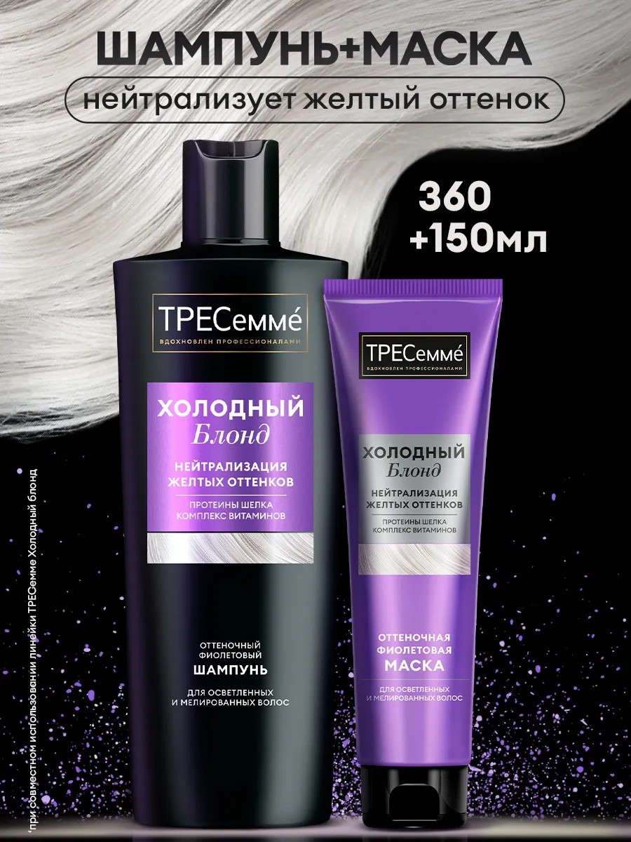 Косметический набор шампунь и маска для ежедневного ухода за осветленными и мелированными волосами ТРЕСеммé Холодный блонд* - уходовые средства для светлых волос, которые эффективно нейтрализуют желтизну. Очищающий женский шампунь и маска для волос разработаны специально для блондинок женщин и девушек.