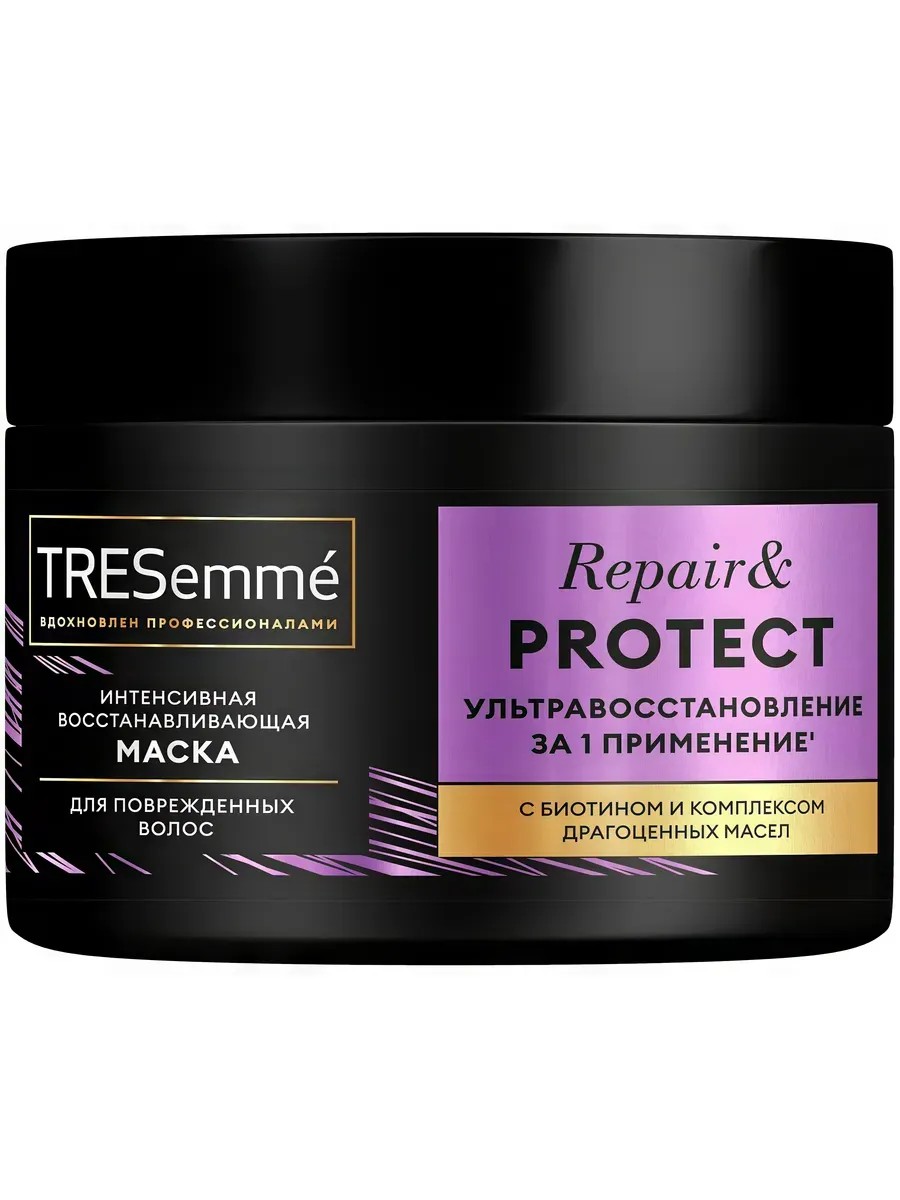Full name: TRESEMME/Тресемме Intensive mask for damaged hair REPAIR AND PROTECT 300 ml. Manufacturer: Unilever Russia. TRESemme Repair&Protect is an intensive restorative mask for damaged and dry hair, inspired by professional care products. This hair mask with biotin and a complex of precious macadamia and shea oils gives visible results - ultra-restoration in one use!