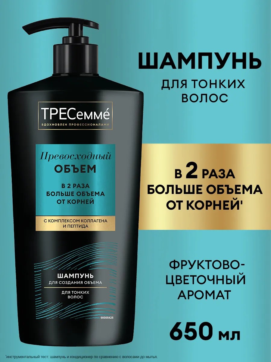 ТРЕСеммé Превосходный Объем — шампунь для объема волос, вдохновленный профессиональными уходовыми средствами. Шампунь с комплексом коллагена и пептида дарит мгновенный результат: в два раза больше объема от самых корней’! Включите шампунь для волос женский ТРЕСеммé Превосходный Объем в ваш бьюти-уход и притягивайте взгляды головокружительной объемной прической: 1. Шампунь для объема волос от корней мягко очищает волосы и кожу головы от избытков себума и загрязнений. 2. Формула с комплексом коллагена и пептида ухаживает за волосами, придает мягкость и мгновенно преображает пряди. 3. Шампунь женский дарит воздушный объем от самых корней. 4. Средство отлично взбивается в пену и легко смывается водой, а приятный аромат делает уход за волосами еще приятнее. Шампунь идеально подойдет для тонких волос и сделает их более объемными, красивыми и блестящими. Также средство для объема волос можно использовать для увеличения плотности’’ волос, чтобы они выглядели ухоженными и сияющими. Способ применения: нанесите на влажные волосы, вспеньте, смойте. При попадании в глаза тщательно промойте их водой. Для максимального эффекта объемной прически дополните ваш уход другими продуктами из коллекции Превосходный Объем. От создания безупречного образа вас отделяет всего четыре шага: 1. Очистите волосы шампунем для объема. 2. Нанесите кондиционер для воздушного объема. 3. Нанесите маску для уплотнения волос. 4. Используйте спрей, чтобы зафиксировать воздушный объем от корней на весь день. В 1948 году в салонах красоты Нью-Йорка был создан ТРЕСеммé – бренд, позволяющий женщинам выглядеть и чувствовать себя уверенно. И все благодаря прическе! ТРЕСеммé вдохновляется профессиональными салонными разработками и предлагает эффективные решения для роскошных волос