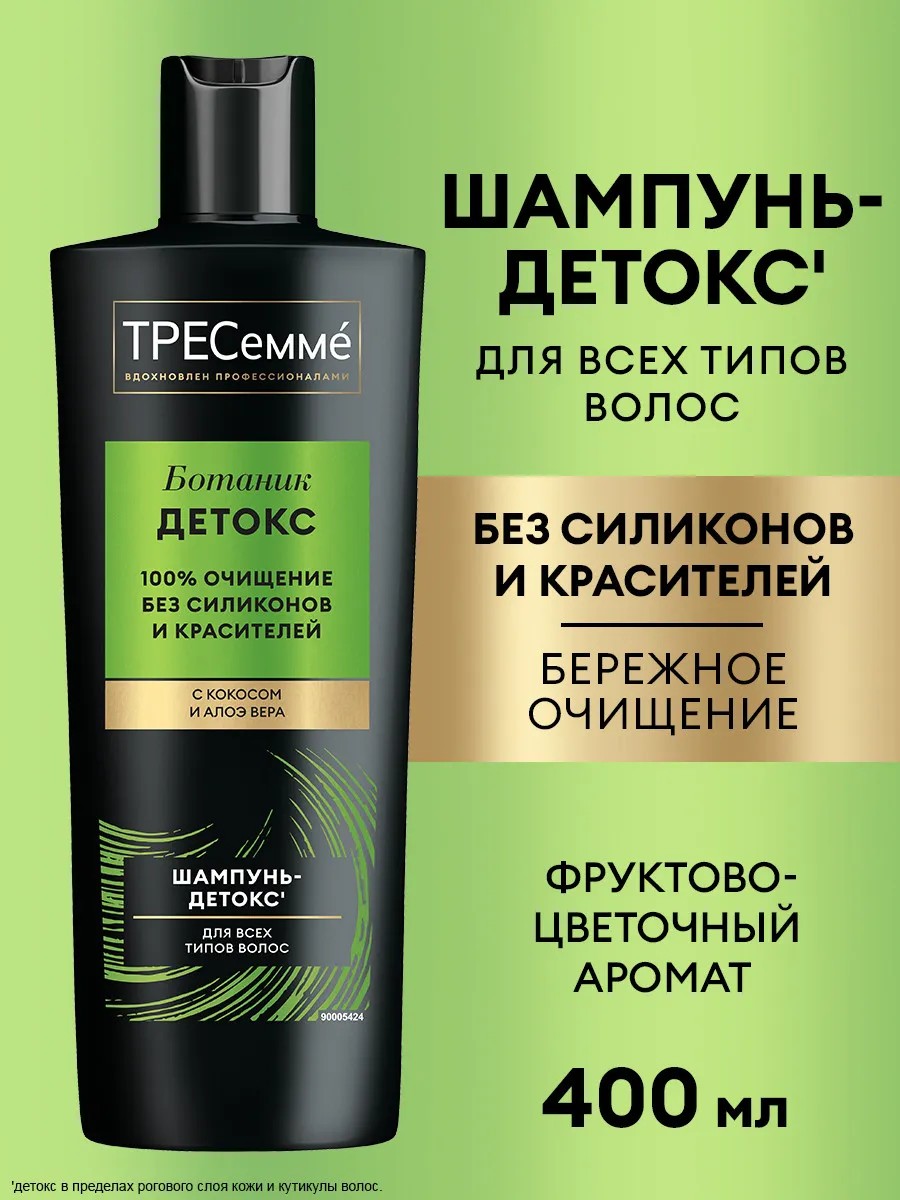 ТРЕСеммé Ботаник Детокс — шампунь-детокс’, вдохновленный профессиональным уходом за волосами. Шампунь с кокосом и алоэ вера наполняет волосы питательными компонентами, делает их красивыми, ухоженными и блестящими. Подарите вашим волосам перезагрузку и качественный уход вместе с шампунем женским ТРЕСеммé Ботаник Детокс: 1. Шампунь эффективно очищает волосы и кожу головы от избытков себума и загрязнений. 2. Формула с кокосом и алоэ вера увлажняет и питает волосы, придавая им блеск. 3. Приятный аромат шампуня для волос с нотами кокоса превращает привычную бьюти-рутину в настоящее наслаждение. 4. В составе шампуня для волос женского нет силиконов и красителей. Шампунь идеально подойдет для всех типов волос и сделает их ухоженными, сияющими и визуально здоровыми. 100% очищение без силиконов, качественный уход за волосами и блеск локонов — с ТРЕСеммé Ботаник Детокс это стало возможно! Способ применения: нанесите шампунь на влажные волосы, вспеньте и смойте. При попадании в глаза тщательно промойте их водой. Для максимального детокс’-эффекта используйте шампунь для волос в комплексе с другими продуктами из коллекции ТРЕСеммé Ботаник Детокс. От создания безупречного образа вас отделяет всего три шага: 1. Очистите волосы и кожу головы шампунем с алоэ вера и кокосом ТРЕСеммé Ботаник Детокс. 2. Нанесите увлажняющий кондиционер для блеска. 3. Используйте стайлинг и наслаждайтесь красивой укладкой на протяжении всего дня! В 1948 году в салонах красоты Нью-Йорка был создан ТРЕСеммé – бренд, позволяющий женщинам выглядеть и чувствовать себя уверенно. И все благодаря прическе! ТРЕСеммé вдохновляется профессиональными салонными разработками и предлагает эффективные решения для роскошных волос