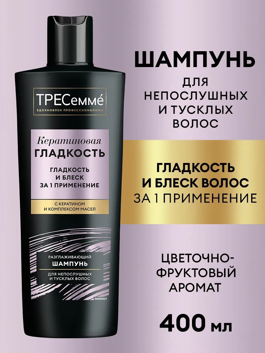 Шампунь с кератином и комплексом масел миндаля и авокадо для волос женский сделает волосы более гладкими и сияющими, а ваша прическа будет выглядеть красиво и ухоженно. Способ применения: нанесите на влажные волосы, вспеньте, смойте. При попадании в глаза тщательно промойте их водой. Для максимального разглаживания волос и ослепительного блеска используйте шампунь в комплексе с другими продуктами из коллекции ТРЕСеммé Кератиновая Гладкость. От безупречного образа вас отделяет всего три шага: 1. Шампунь для мягкого очищения. 2. Кондиционер для питания, разглаживания волос и экстраблеска’. 3. Стайлинг для надежной фиксации укладки на весь день. В 1948 году в салонах красоты Нью-Йорка был создан ТРЕСеммé – бренд, позволяющий женщинам выглядеть и чувствовать себя уверенно. И все благодаря прическе! ТРЕСеммé вдохновляется профессиональными салонными разработками и предлагает эффективные решения для роскошных волос