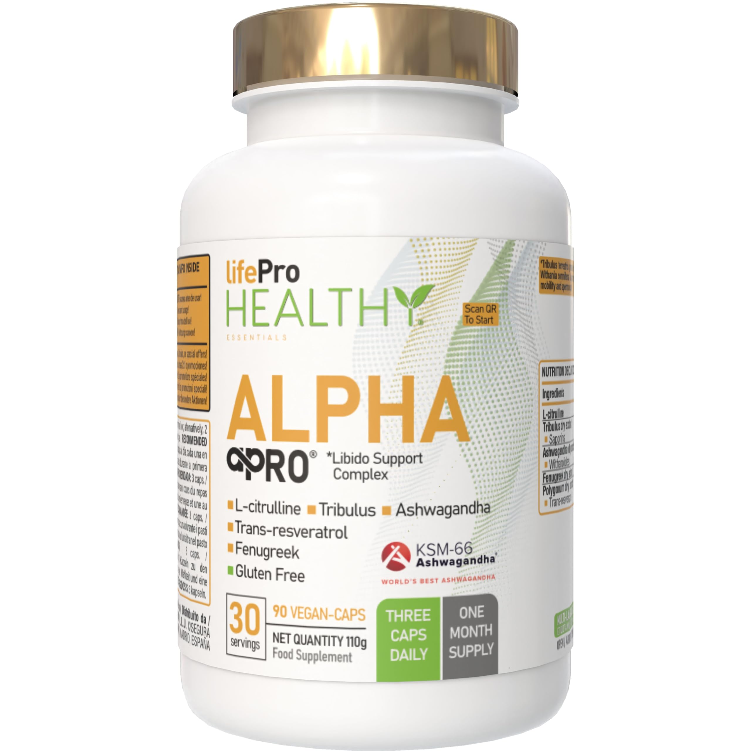 SMART LABEL FOR TOTAL TRANSPARENCY – Scan the QR code to access certificates, usage instructions, FAQs, and complete product traceability. FENUGREEK RESVERATROL – ENERGY PROTECTION – With 600mg of Fenugreek and Resveratrol (98 pure), Alpha Pro supports daily vitality and provides an antioxidant boost that helps protect cells from oxidative stress. L-CITRULLINE – CIRCULATION RECOVERY – Alpha Pro provides 800mg of L-Citrulline, an amino acid known to contribute to energy metabolism and the maintenance of healthy circulation. A helpful aid for endurance and post-exercise recovery. ASHWAGANDHA KSM-66 – BALANCE SUPPORT - Stress can take a toll on vitality. Alpha Pro includes Ashwagandha KSM-66 (600mg), an extract documented to contribute to mental and physical well-being and support recovery. ? STANDARDIZED ACTIVE SAPONINS – 675MG PER SERVING - Competitors advertise high mg counts but often low active ingredients. Alpha Pro provides 750mg of 90 standardized Tribulus, which translates to 675mg of actual saponins per serving — transparency that guarantees what you're consuming. NOT JUST TRIBULUS – A COMPLETE FORMULA - Many brands limit themselves to Tribulus alone and advertise high numbers. Alpha Pro combines Tribulus (750mg, standardized to 90 saponins) with Ashwagandha KSM-66, Fenugreek, L-Citrulline and Resveratrol — a balanced combination to support daily energy and vitality.
