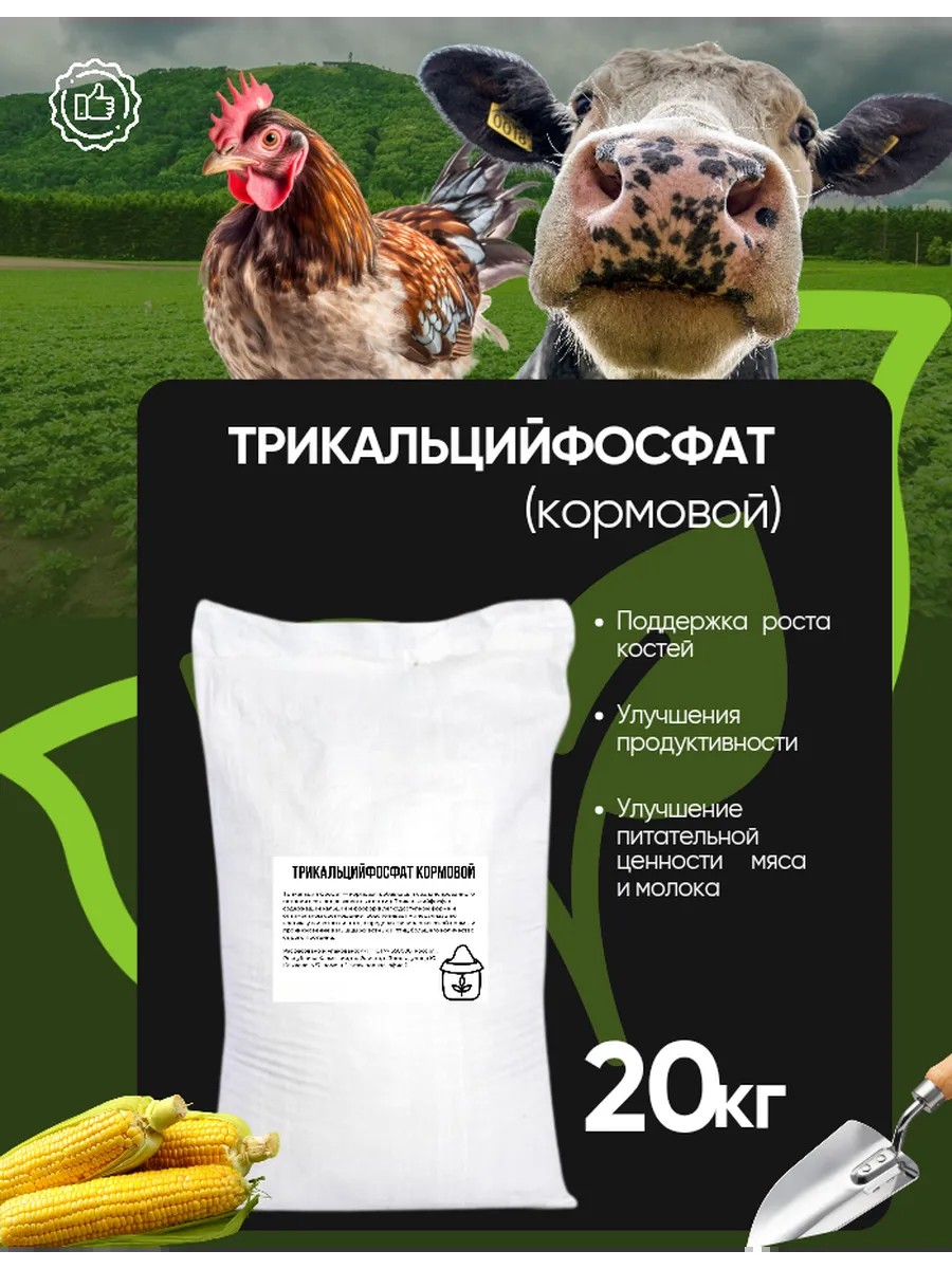 Трикальций фосфат — кормовая добавка для сбалансированного питания всех видов животных и птиц. Трикальцийфосфат содержащий кальций и фосфор в легкодоступной форме и оптимальном соотношении, обеспечивает минерализацию костяка у животных и птиц в пределах физиологической нормы и проникновение в мышцы животных и птиц большего количество сырого протеина.