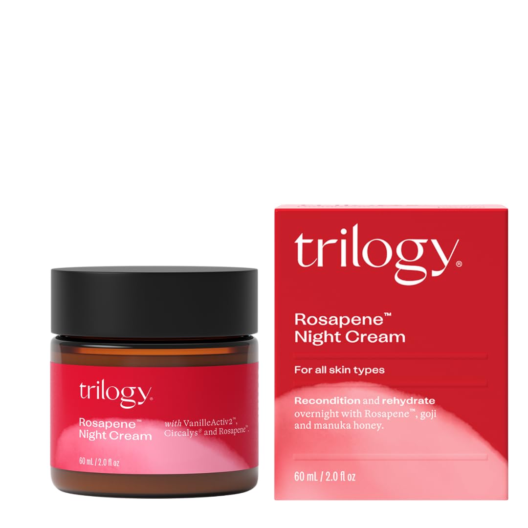 The Rosapene Night Cream is a very nourishing and regenerating night cream that helps you start the day with a radiant complexion. Enriched with Trilogy's unique rosehip antioxidant complex roapene, Goji berries and New Zealand Manuka honey, this rich night care stimulates and regenerates the skin and provides it with moisture. Suitable for all skin types. Use: Apply to cleansed skin every evening before going to bed.Regenerating and nourishing night cream.Rosapene™ Night Cream De Rosapene Night Cream is een zeer voedende en regenererende nachtcrème, die je helpt om de dag met een stralende huidbeeld te beginnen. Verrijkt met het unieke rozenbottel-antioxidant-complex roapene van Trilogy, Goji-bessen en Nieuw-Zeelandse Manuka-honing, stimuleert en regenereert deze rijke nachtverzorging de huid en voorziet deze van vocht. Geschikt voor alle huidtypes. Gebruik: Elke avond voor het slapengaan op de gereinigde huid aanbrengen.Regenererende en voedende nachtcrème.