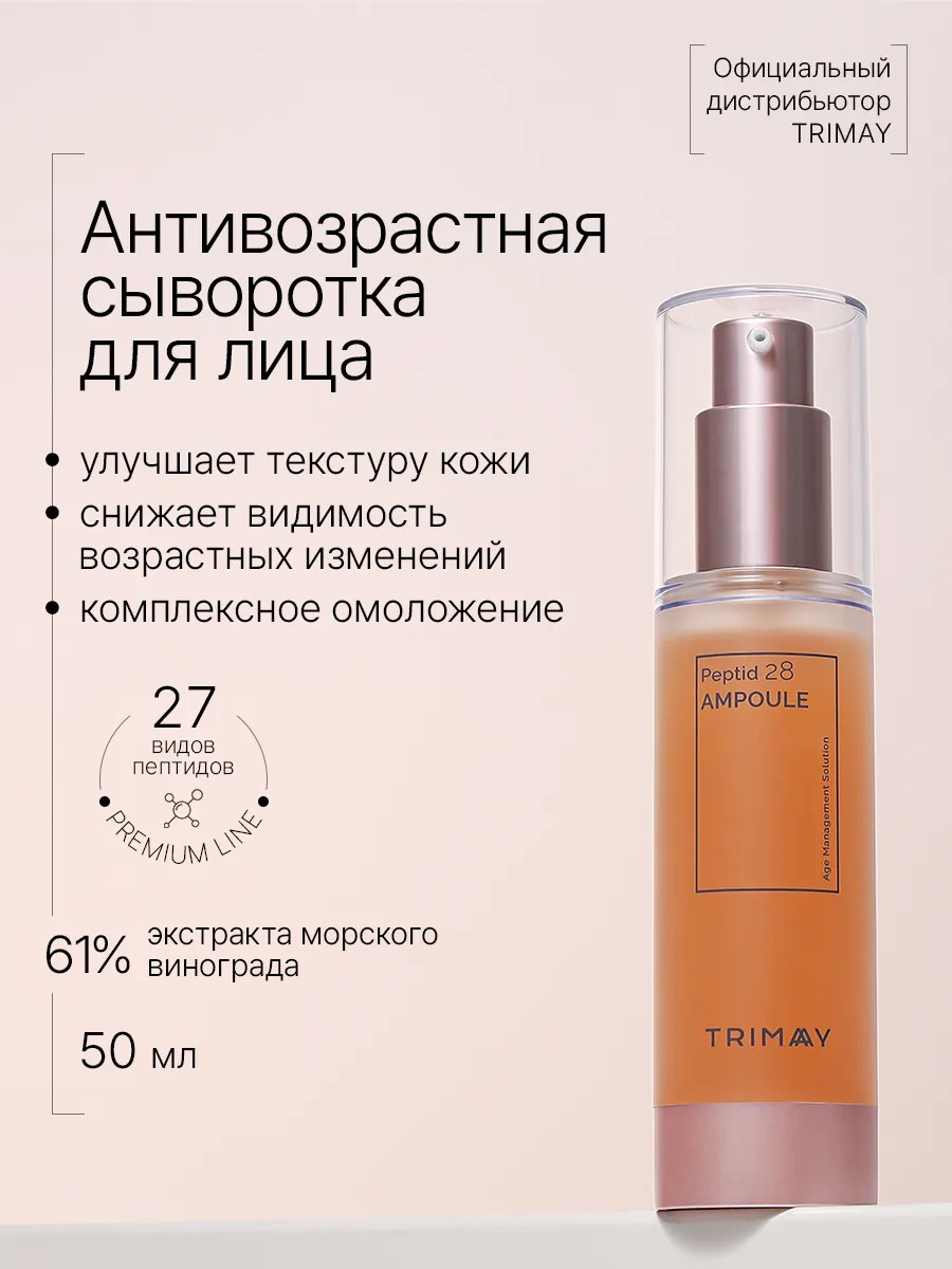 Dive into the world of Korean cosmetics with this hydrating facial serum, which will become your essential skincare assistant. This nourishing serum, created using advanced technology, offers a comprehensive rejuvenating and lifting effect. Its main ingredient, sea grape extract, saturates the skin with minerals and vitamins necessary for maintaining youth and health. The Trimay Peptid 28 Ampoule rejuvenating facial serum is a professional product that combats the signs of aging, reducing the appearance of wrinkles and fine lines. A complex of 28 peptides stimulates collagen production, promoting firmness and elasticity. Thanks to niacinamide, this organic anti-wrinkle serum effectively combats post-acne and freckles, evening out skin tone and adding radiance. This skincare product is suitable for all skin types, including oily, dry, and combination skin. This smoothing ampoule doesn't leave a sticky feeling or clog pores, making it ideal for daily use. Hyaluronic acid provides deep hydration, retaining moisture within the epidermal layers and preventing dehydration. This anti-aging, anti-wrinkle serum also has anti-inflammatory and wound-healing properties, making it indispensable for sensitive skin. Natural and hypoallergenic EWG Green ingredients guarantee safety and effectiveness, even for the most delicate skin. This Korean serum makes a great gift for anyone who values high-quality facial care. The convenient packaging allows you to take it with you on the road, on a business trip, or on vacation, providing your skin with the care it needs anytime, anywhere. Discover the secrets of Asian cosmetics and give your skin youth and beauty for years to come. An ideal gift choice for any occasion for a woman or a gift for mom. Originally from Korea. You can purchase an innovative lifting serum with peptides and vitamins at the Trimay Official store, an original Korean cosmetics store.