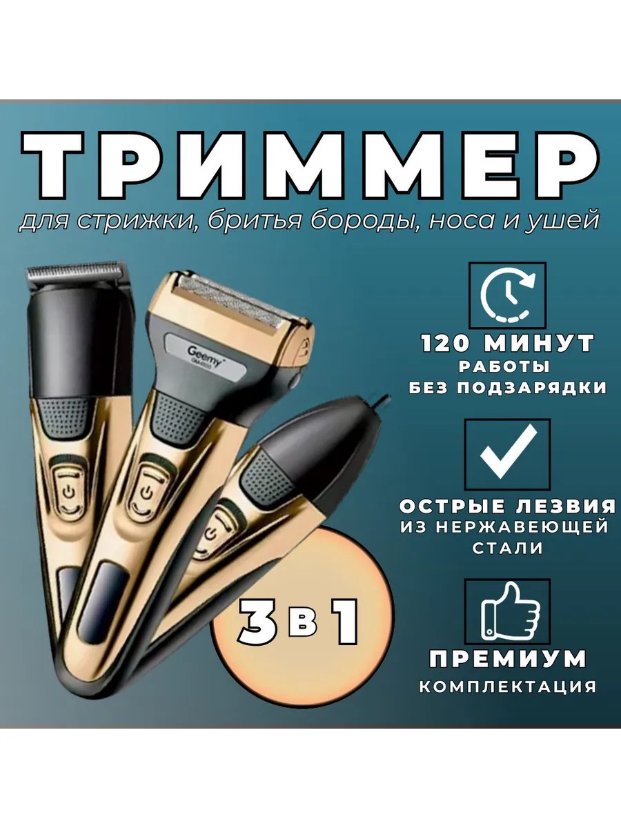 Триммер 3в1 - это универсальное устройство, которое позволяет мужчинам легко поддерживать аккуратный вид своей бороды и усов. Этот триммер предлагает многофункциональность - он не только обрезает волосы на бороде, но и оснащен специальными насадками для тримминга ушей и носа.Электрическая бритва оснащена острыми лезвиями, которые обеспечивают безопасное и комфортное бритье. Вы сможете легко подравнивать и обрезать волосы, чтобы получить идеальную форму. Триммер для ушей и носа позволит вам быстро и безболезненно убрать нежелательные волоски.Компактный и удобный в использовании, этот триммер идеально подходит для путешествий и поездок. Он работает от аккумулятора, что позволяет вам использовать его в любом месте и в любое время. Благодаря своей эргономичной конструкции и прочному материалу, данный триммер будет служить вам долгое время.Триммер 3в1 - это надежное и стильное решение для тех, кто ценит ухоженный вид своей бороды и усов.Geemy GM-6650 / Бритва / Безболезненное удаление волос / Электрическая бритва