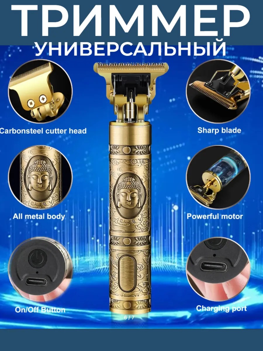 This trimmer will become an indispensable assistant for men who care about their appearance. You can easily create the perfect haircut or neatly trim your hair at home. The incredible versatility of this electric trimmer allows you to shave your beard, mustache, or pubic area, as well as trim your body hair effortlessly. Its advanced design and durable metal body guarantee a long service life. The trimmer comes with several attachments, allowing you to choose the optimal cutting length. A blade guard ensures safe use, and the cordless battery provides complete freedom of movement when trimming. Incidentally, this trimmer has ultra-thin blades that glide easily and gently over your skin without irritation. And thanks to its battery, charging takes no time, making it perfect for working anywhere. You'll be pleasantly surprised by the versatility of this device. This trimmer isn't just a hair clipper or shaver; it's a true professional hairdresser. Forget about trips to the barber. This portable trimmer is a cordless, versatile device for trimming hair, beards, and mustaches. It comes with an electric trimmer, a small brush for maintenance, and four interchangeable combs (1, 2, 3, and 4 mm). The sleek design and ergonomic handle make it comfortable to hold. It comes in a gold color. Key features include a waterproof iron body that allows you to rinse the system after trimming and cutting, sharp stainless steel blades, and a lightweight aluminum body. A charger and rechargeable battery are also included.