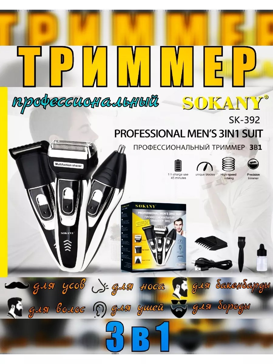 To create a neat look, a man needs to maintain his body hair. Hair, beard, mustache, chest hair—it's impossible to imagine meticulously grooming all these areas without professional equipment! The SOKANY SK-392 trimmer is a true professional in the world of trimmers. Its stylish design is unmistakable! A must-have tool for professional barbers, and a perfect gift for your bearded friends! Charging time is 1 hour. Full power provides 45 minutes of continuous use. The set includes 4 attachments: 1 mm, 2 mm, 3 mm, and 4 mm. It doesn't irritate the skin or stick to hair. The safety head guides hair into the blade and protects the skin from direct contact. The blade is made of high-quality metal, preventing it from dulling quickly. The ergonomic shape and attractive design. The plastic housing is moisture-resistant. The trimmer is very easy to clean thanks to the included brush. Power: built-in lithium battery.