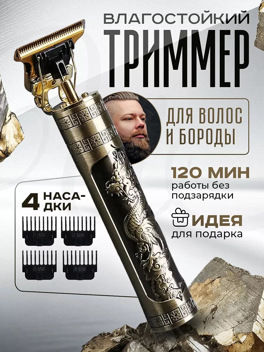 A portable barbershop-style beard and mustache trimmer—a cordless, versatile device for removing and trimming hair. This high-quality, convenient electric shaver will save you money on hairdressing and stylist fees, various creams and replacement razor heads, and a metal razor and cartridges. This shaver is designed for a daily, clean, dry shave. Ideal for home and travel use, a safety razor will help you trim your beard. This men's shaver is gentle on skin and easy to maintain. The kit includes: an electric trimmer, lubricating oil, a small brush for tool maintenance, and four replaceable attachments (1.5, 2, 3, and 4 mm). The sleek design and ergonomic handle make it comfortable to hold. The on/off button is located at the bottom of the handle, preventing accidental contact during use. The device's key features include a waterproof aluminum body that allows you to rinse the system after trimming and cutting, sharp stainless steel blades, and a lightweight aluminum body instead of plastic with a dragon pattern. This trimmer cuts as well as a professional or premium-quality device. A beard grooming kit removes excess length. A charger and rechargeable battery are also included. This men's trimmer perfectly shaves hairs of varying stiffness. This versatile device for removing facial hair easily handles any task, allowing you to control unwanted hair growth. Unique styling and a flawless appearance make this a great choice for men who value time and quality. A hair clipper with a brush and charger makes a great birthday gift for a husband, brother, father, grandfather, son, grandson, colleague, or anyone. An electric razor is an inexpensive, budget-friendly gift for adult men, and a great shaving gift set. Travel-friendly and practical!