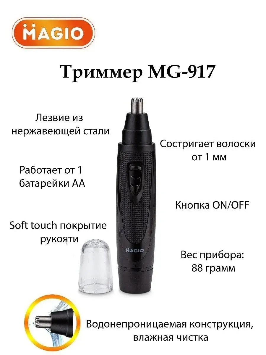 Благодаря триммеру MG-917 вы совершенно безболезненно и безопасно сможете удалить волосы в носу и ушах. Универсальный ручной триммер обтекаемой формы, имеет вращающуюся головку и узкий носик. Лезвие выполнено из нержавеющей стали. Это важная деталь любого профессионального триммера, от которой зависит как безопасность удаления волос из ушей и носа, так и комфорт. Маленький мужской электро триммер удобный, хорошо сидит в руке. Благодаря комфортной ручке он не скользит, что приводит вероятность травмирования практически к нулю. Работает от аккумулятора - одной пальчиковой батарейки. Если понадобится сменить батарейку, то это легко сделать, провернув корпус и открыв его. Нож после использования можно чистить с помощью щеточки, которая идет в комплекте. Хорошо продумано, так как лезвие остается чистым. Электрический прибор компактный и много места не занимает. Мини триммер для коррекции количества нежелательных волос на лице мужчин, женщин и детей. Если вы ищите более многофункциональный парикмахерский прибор для бритья головы, усов, бороды и удаления волос с тела, советуем вам присмотреться к другим моделям аккумуляторных машинок и бритв Magio, нажав на логотип бренда.