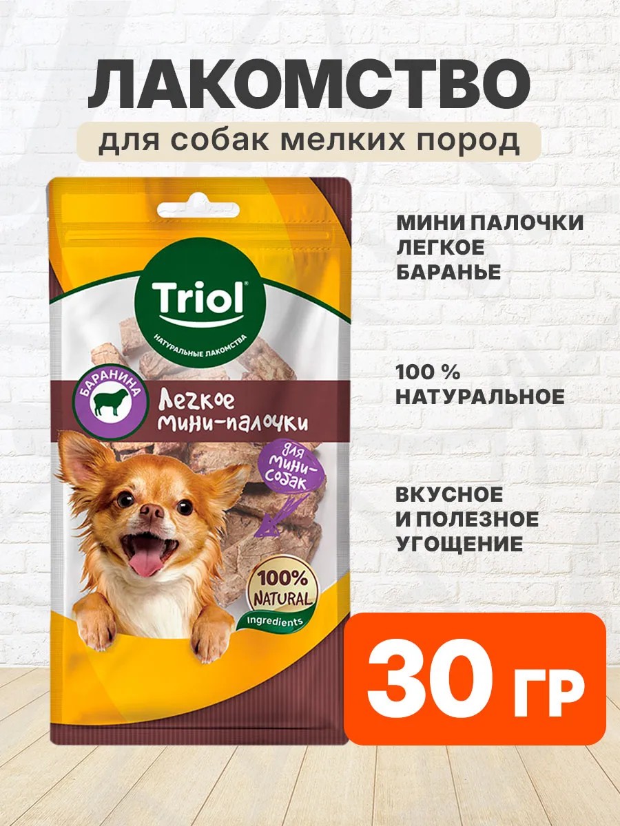 Лакомство Triol для собак маленьких пород мини палочки легкое баранье 30 гр. Мини-палочки из бараньего легкого – это 100% натуральное лакомство для собак, приготовленное с сохранением всех полезных свойств.