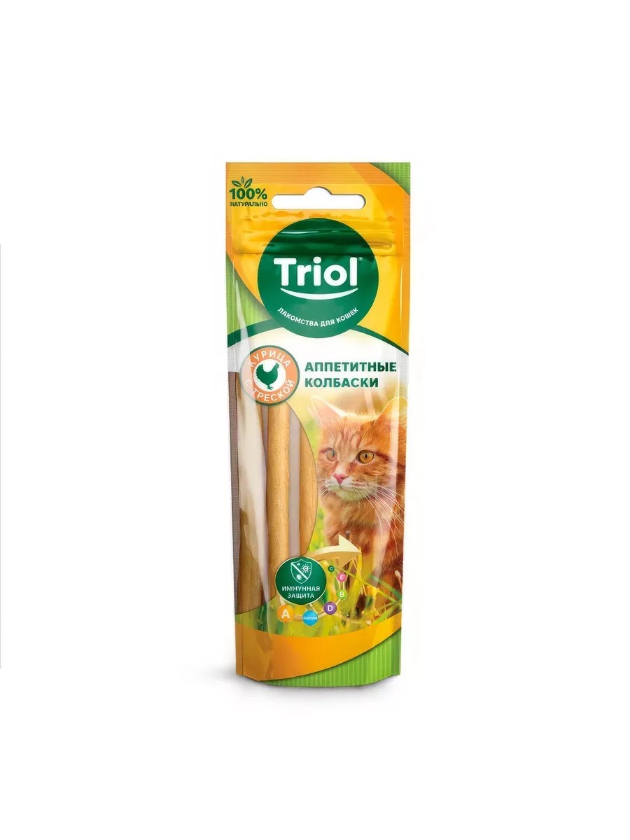 Triol аппетитные колбаски из курицы с треской для кошек, 40 г. Аппетитные колбаски из курицы с треской - это полезное угощение для здоровья вашего питомца, обогащенное общеукрепляющим комплексом витаминов A, E и D3. Вес нетто 40г.Состав: мясо курицы - 30%, мясо трески - 30%, мука - 9%, рыбная мука - 8%, животные жиры - 8%, сорбитол - 7%, глицерин - 7%.