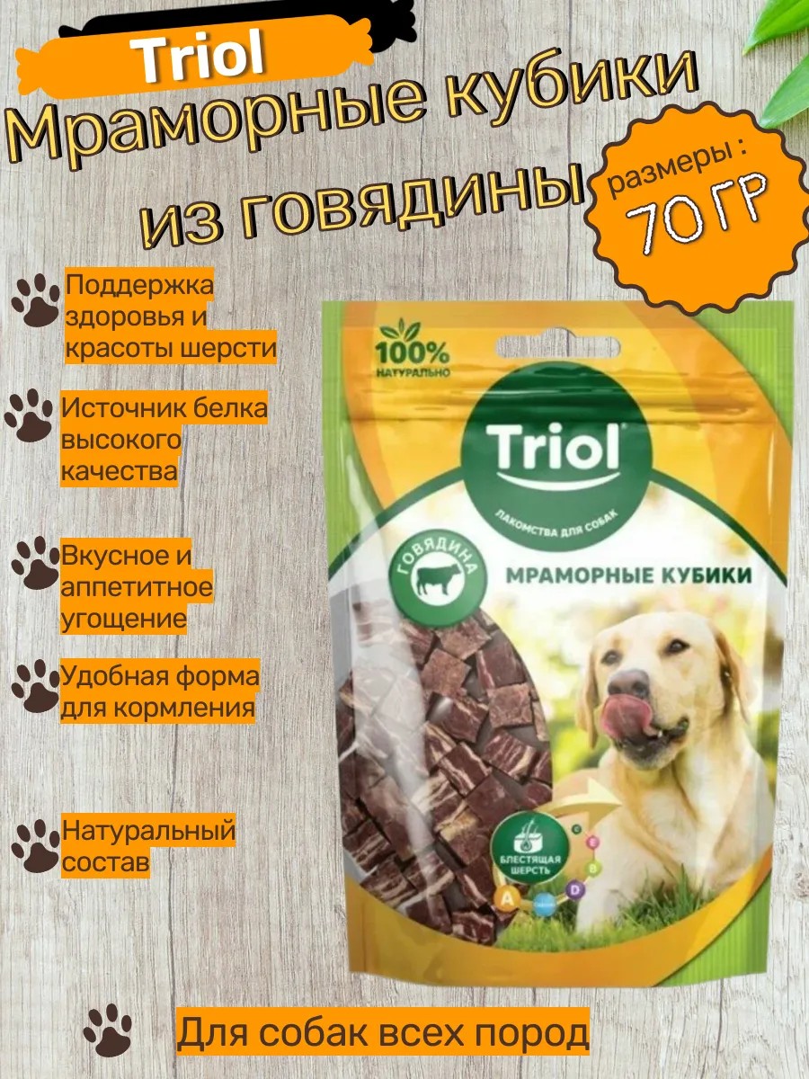 Преимущества лакомства Triol “Мраморные кубики из говядины” для собак (70г):
