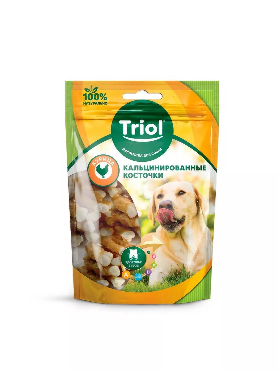 Triol кальцинированные косточки с курицей для собак, 70 г. Кальцинированные косточки с курицей - это полезное угощение для профилактики зубного камня, здоровья структуры костных тканей и обеспечения функциональности кровообращения, обогащенное кальцием, фосфором и железом. Вес нетто 70г.Состав: мясо курицы - 46%, кальцинированная кость - 43% (мука - 40%, молоко - 3%), растительный белок - 7%, глицерин - 2%, сорбитол - 2%.