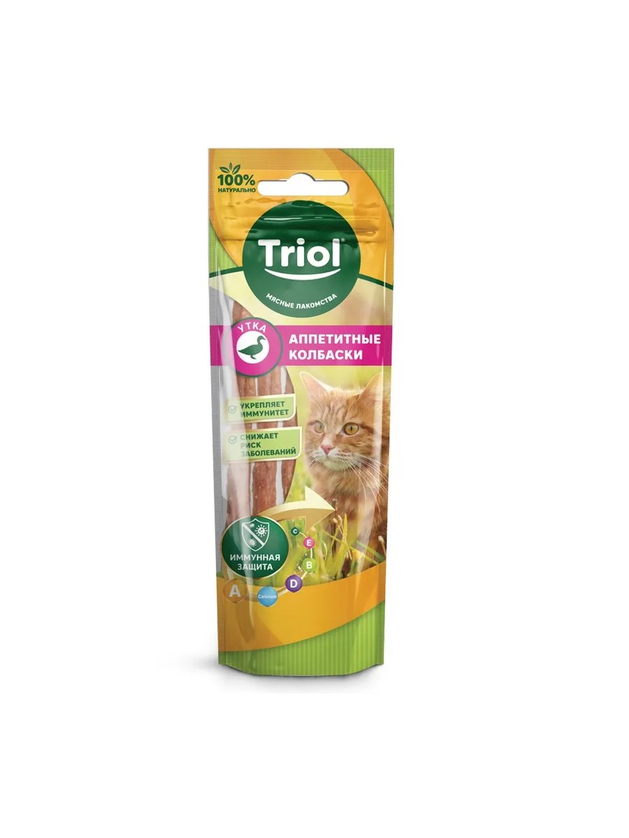 Аппетитные колбаски из утки – это полезное угощение для здоровья вашего питомца, обогащенное общеукрепляющим комплексом витаминов A, E и D3. Вес нетто 40г.