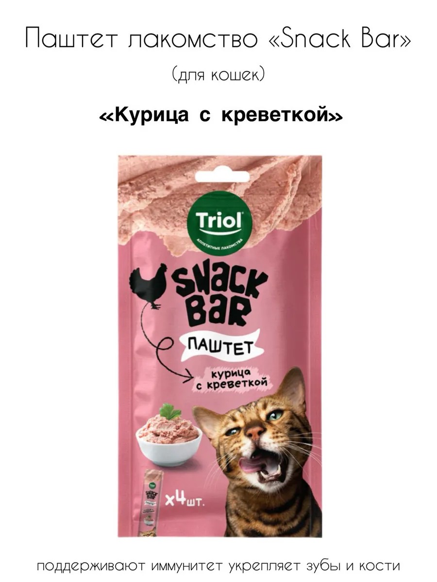 Chicken and Shrimp Pate Cat Treat, 40g, SNACK BAR Series, Triol. Juicy chicken and shrimp pate is a healthy and filling treat for cats. The delicate texture of the pate, exquisite taste and aroma will certainly conquer your pet. The balanced composition of the treat strengthens the immune system and contains moisture, which cats need for healthy digestion. Net weight 40 g. Ingredients: chicken - 65.1%, starch - 12%, water - 11.58%, vegetable oil - 6%, shrimp - 5%, agar - 0.2%, yeast extract - 0.1%, natural antioxidants - 0.02%.