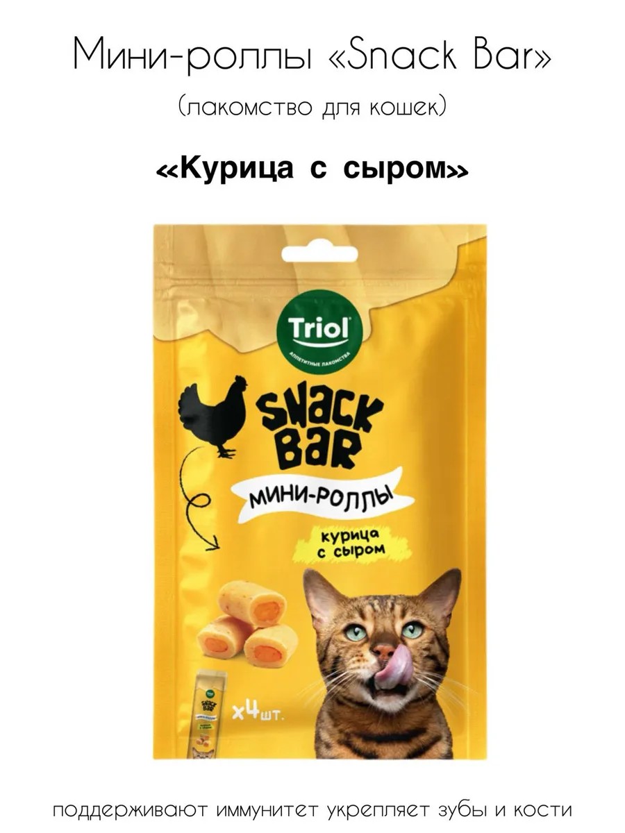 Cat treat "Mini rolls with chicken and cheese filling", 40g, SNACK BAR series, Triol. Mini rolls with chicken and cheese are delicious rolls with a delicate filling. The soft texture and bright taste will make this treat your pet's favorite. This treat contains healthy ingredients for your pet's active life and will be an excellent addition to the main diet. Net weight 40 g. Ingredients: chicken - 79.9%, cheese - 8%, bonito fish - 5%, starch - 5%, peanut protein - 2%, yeast extract - 0.1%.