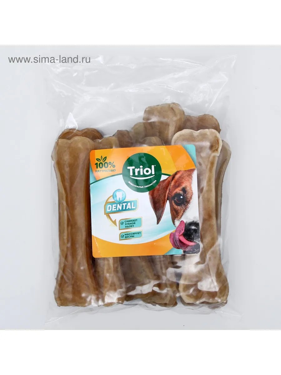 TRIOL sinew bone, 16 cm, 10 pcs, 80-85 g. White knotted bone for dogs from TRIOL are useful products presented in the form of a bone with knots at the ends. Bones have always been and remain indispensable for dogs. They serve as a toothbrush, a jaw trainer, a favorite toy, and simply a pleasant pastime for any dog. Sinew bones are a unique development of veterinarians, created specifically for dogs of all ages. They help dogs protect their teeth from tartar, clean the interdental space, and train the jaw muscles. They attract your pet for a long time, which reduces the risk of gnawing on interior items and personal belongings. Your pet will enjoy gnawing on a bone made from natural materials. You can choose a bone that is the perfect size for your pet. Ingredients: rawhide.