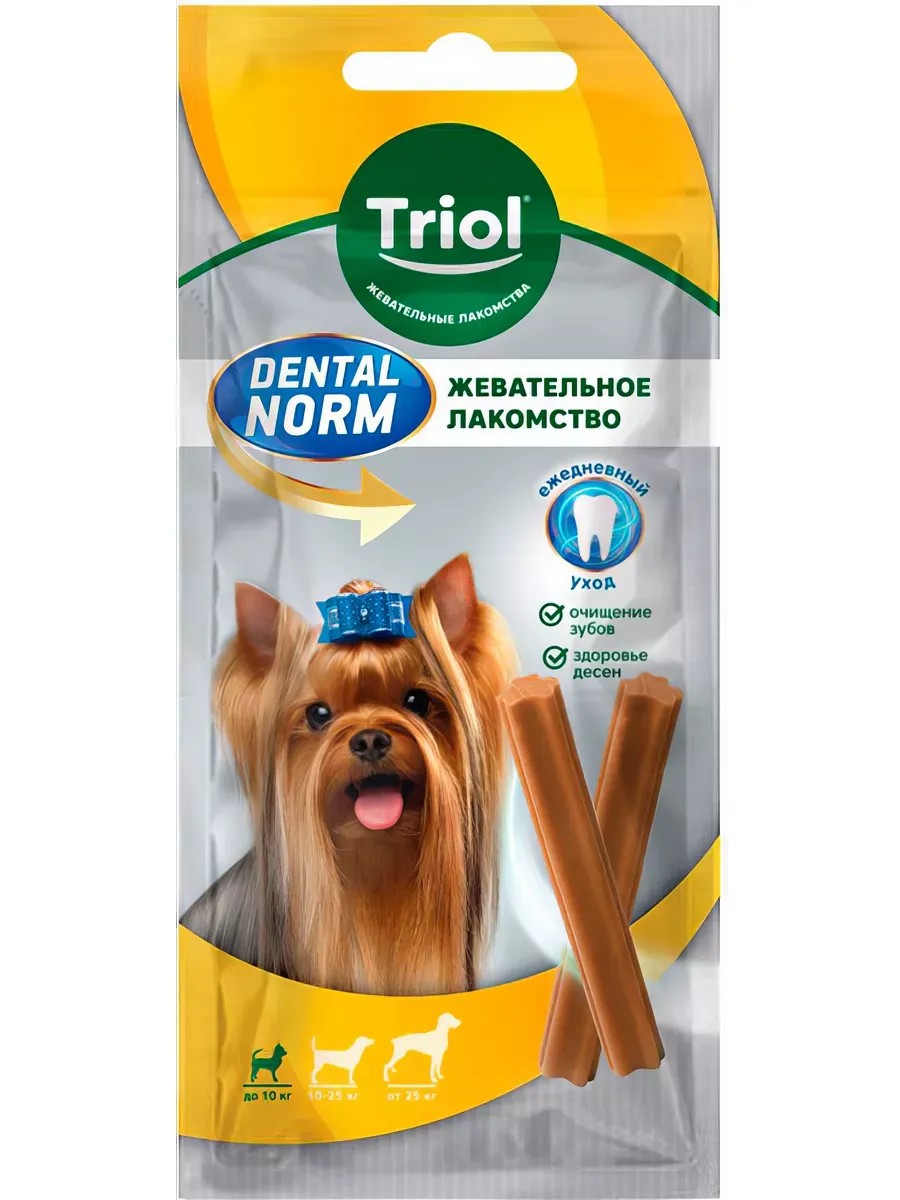 Triol DENTAL NORM Chew Sticks for Small Breed Dogs, 45 g. Chew Sticks for Small Breed Dogs, Pack of 3, DENTAL NORM Series. DENTAL NORM dog treats offer simple and effective oral care. Tartar buildup in dogs is common, especially in animals over three years old. Therefore, it is important to know how to get rid of it and prevent its occurrence. Daily consumption of DENTAL NORM treats from TRIOL helps reduce the risk of oral diseases, effectively clean teeth, reduce plaque, and freshen breath. Ingredients: Cornstarch, water, glycerin, rice flour, chicken liver powder, beef gelatin, artificial beef flavor, artificial colors, sodium hexametaphosphate, rosemary, salt, disodium guanylate, potassium sorbate, sodium dehydroacetate, disodium EDTA, calcium propionate, sodium pyrophosphate, baker's yeast.