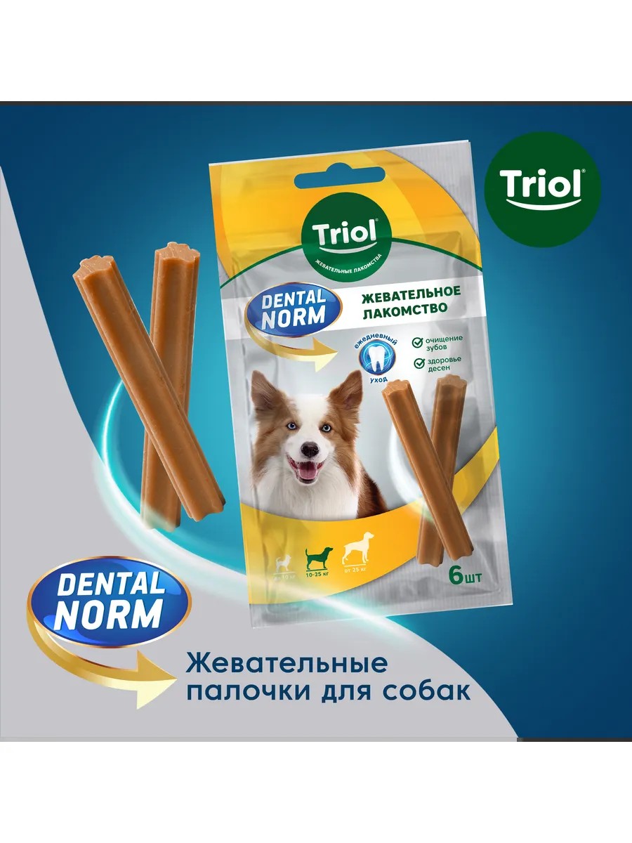 Лакомство для собак DENTAL NORM — это простой и эффективный способ заботы о здоровье полости рта вашего питомца. Зубной камень у собак — распространенная проблема, особенно у животных старше трех лет. С возрастом риск его появления возрастает, и важно знать, как предотвратить это неприятное явление.Ежедневное употребление лакомств DENTAL NORM от TRIOL поможет вам не только избавиться от уже образовавшегося налета, но и значительно снизить риск заболеваний полости рта. Эти лакомства разработаны с учетом потребностей собак и содержат специальные ингредиенты, которые способствуют качественной очистке зубов и десен.Кроме того, DENTAL NORM эффективно уменьшает образование налета и освежает дыхание вашего четвероногого друга. Заботьтесь о здоровье зубов вашего питомца с DENTAL NORM — это не только полезно, но и вкусно!