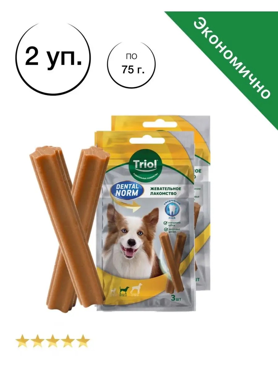 Treats for medium-sized dogs, "Chew Sticks," 75 g (pack of 3), DENTAL NORM series. DENTAL NORM dog treats offer simple and effective oral care. Tartar buildup in dogs is common, especially in animals over three years old. Therefore, it's important to know how to get rid of it and prevent its occurrence. Daily consumption of DENTAL NORM treats from TRIOL helps reduce the risk of oral diseases, effectively clean teeth, reduce plaque, and freshen breath. Ingredients: Cornstarch, water, glycerin, rice flour, chicken liver powder, beef gelatin, artificial beef flavor, artificial colors, sodium hexametaphosphate, rosemary, salt, disodium guanylate, potassium sorbate, sodium dehydroacetate, disodium EDTA, calcium propionate, sodium pyrophosphate, baker's yeast.