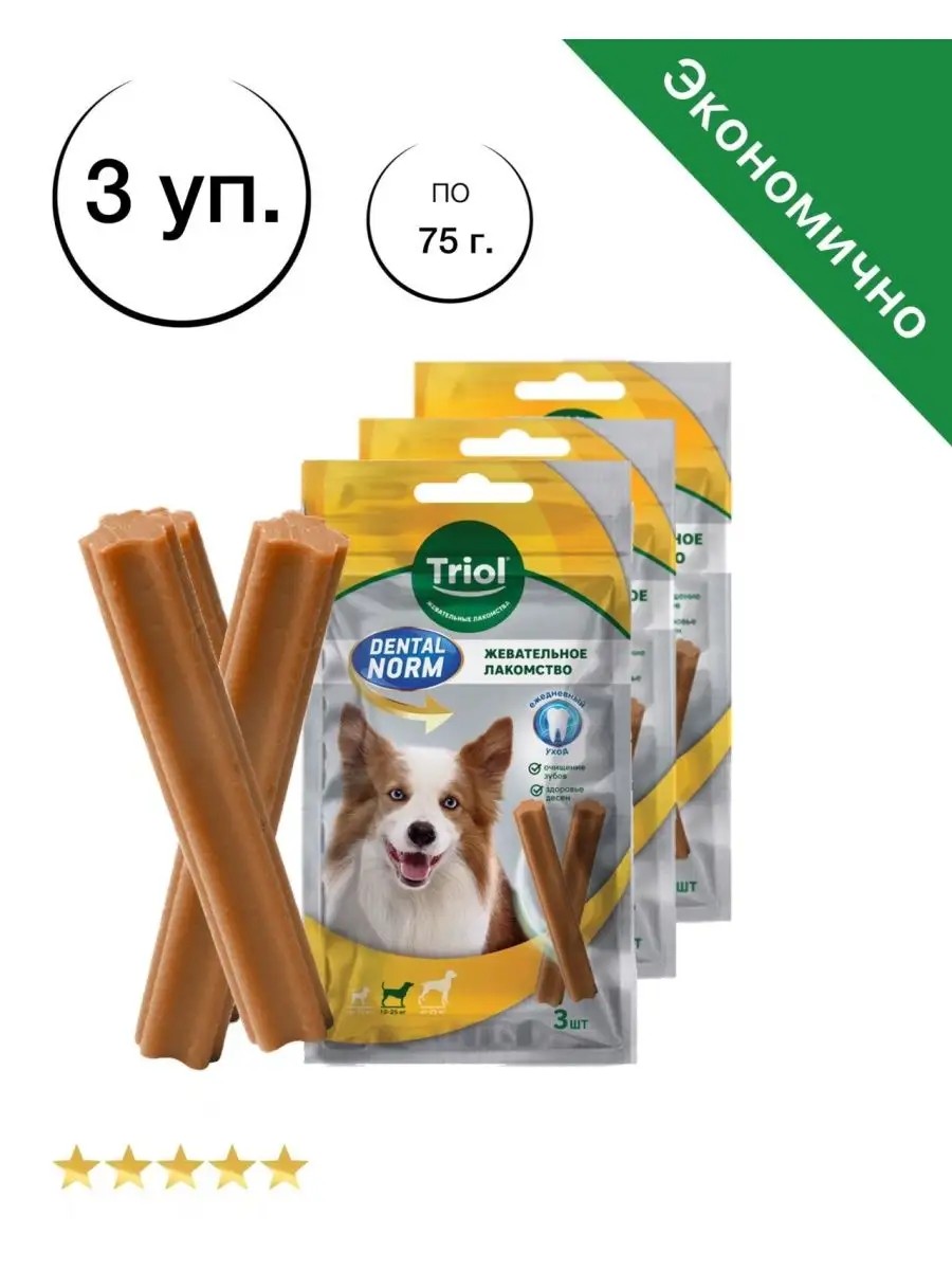Treats for medium-sized dogs, "Chew Sticks," 75 g (pack of 3), DENTAL NORM series. DENTAL NORM dog treats offer simple and effective oral care. Tartar buildup in dogs is common, especially in animals over three years old. Therefore, it's important to know how to get rid of it and prevent its occurrence. Daily consumption of DENTAL NORM treats from TRIOL helps reduce the risk of oral diseases, effectively clean teeth, reduce plaque, and freshen breath. Ingredients: Cornstarch, water, glycerin, rice flour, chicken liver powder, beef gelatin, artificial beef flavor, artificial colors, sodium hexametaphosphate, rosemary, salt, disodium guanylate, potassium sorbate, sodium dehydroacetate, disodium EDTA, calcium propionate, sodium pyrophosphate, baker's yeast.