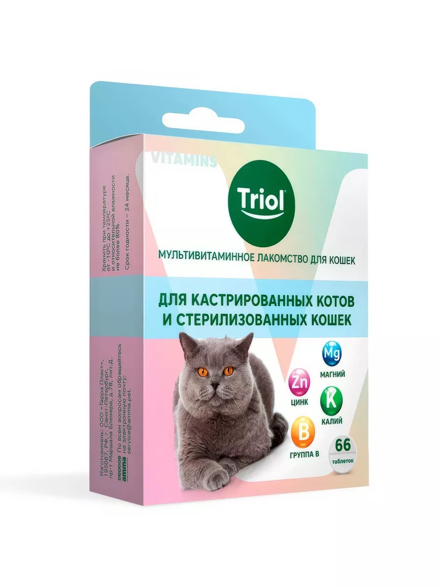 Triol мультивитаминное лакомство для кошек "Для кастрированных котов и стерилизованных кошек", 33 г. Мультивитаминное лакомство TRIOL это источник полезных веществ, необходимых для укрепления иммунитета и обеспечения нормального обмена веществ вашей кошки. Основной рацион, как правило, содержит только базовый набор микроэлементов и не учитывает особенностей конкретного питомца, его предрасположенности к заболеваниям, а также увеличения потребности в витаминах во время стресса. Мультивитаминное лакомство TRIOL решает эти проблемы и эффективно заботится о здоровье вашего питомца. Мультивитаминное лакомство TRIOL разработано с учетом основных проблем кастрированных котов и стерилизованных кошек. Пивные дрожжи в составе источник витаминов, в частности всей группы В, что позволяет устранить авитаминоз после приема антибиотиков и укрепить иммунитет питомца.