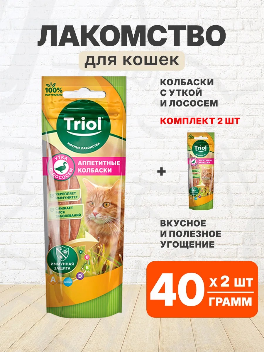 Triol Лакомство колбаски аппетитные для кошек утка лосось 40 г 2шт