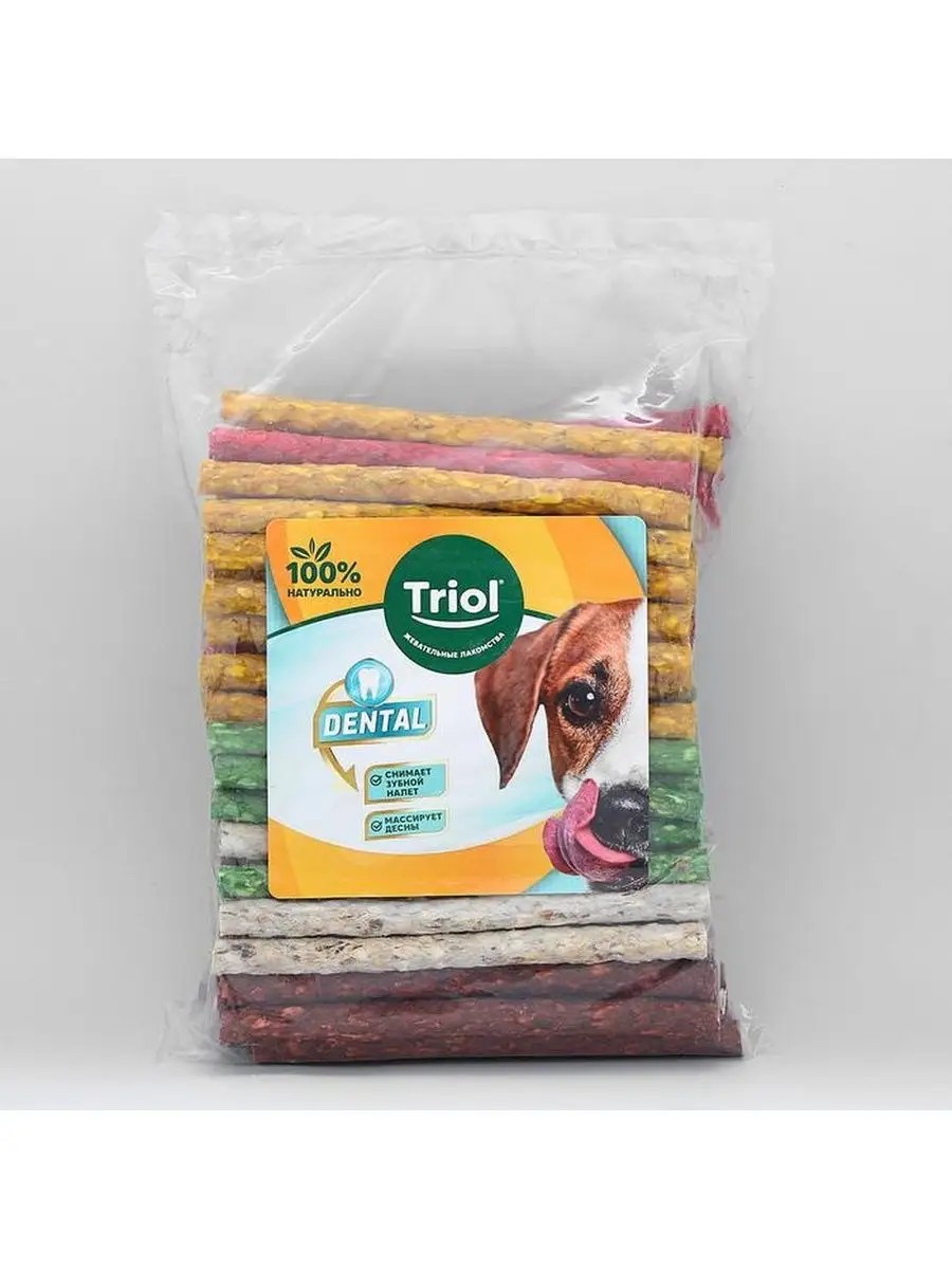 DENTAL pressed treat sticks for dogs, d=1 cm x 13 cm, 8-10 g, 100 pcs. TRIOL knotted dog bones are healthy treats presented in the form of a bone with knots at the ends. Bones have always been and remain an indispensable item for dogs. This toothbrush, jaw trainer, favorite toy, and simply a pleasant pastime for any dog are all in one. These sinew bones are a unique development by veterinarians, created specifically for dogs of all ages. They help protect dogs' teeth from tartar, clean interdental spaces, and train jaw muscles. They engage your pet for a long time, reducing the risk of chewing on home furnishings and personal belongings. Your pet will enjoy gnawing on a bone made from natural materials. You can choose a bone that is the perfect size for your pet. Ingredients: rawhide, food coloring.