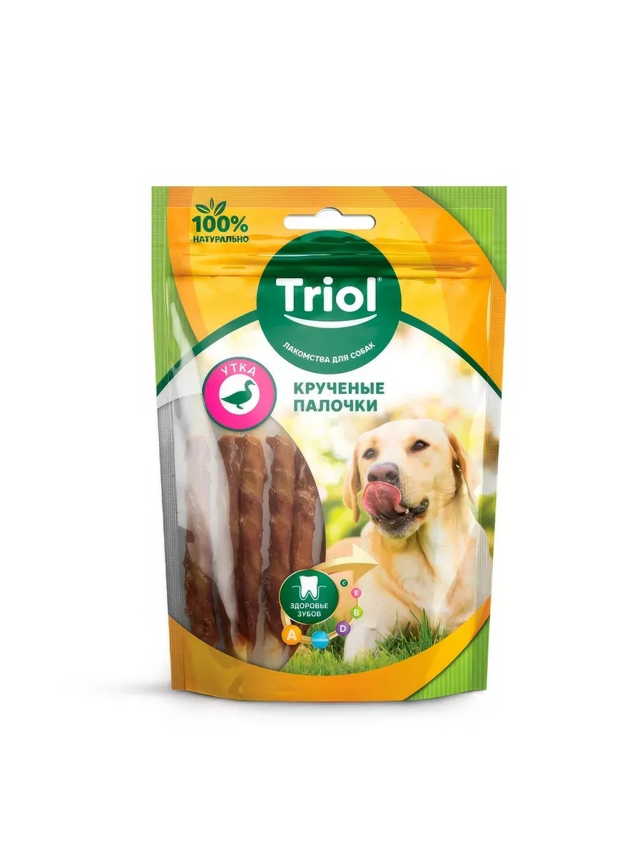 Triol крученые палочки с уткой для собак, 70 г. Крученые палочки с уткой - это полезное угощение для профилактики зубного камня, здоровья структуры костных тканей и обеспечения функциональности кровообращения, обогащенное кальцием, фосфором и железом. Вес нетто 70г.Состав: мясо утки - 47%, сыромятная кожа - 42%, растительный белок - 7%, сорбитол - 2,5%, глицерин - 1,5%.