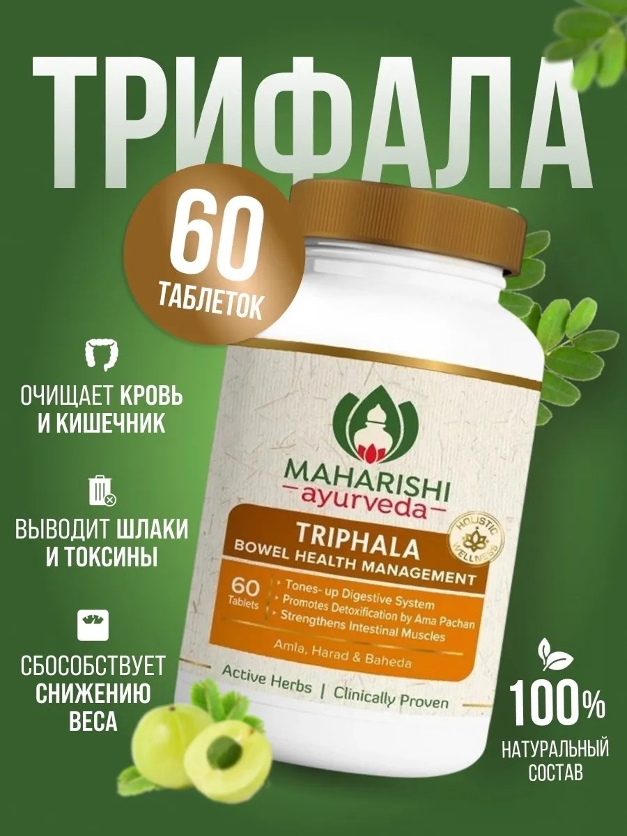 **Трифала Triphala Maharishi Ayurveda** - легендарное аюрведическое средство, которое представляет собой формулу для оздоровления и очищения организма от токсинов, а также повышения защитной функции иммунитета.Назначение:Диспепсия, запор различного происхождения, гастропарез, кардиологические проблемы, ослабленное состояние после операции, диабет, нарушения пищеварения, повышенное давление, проблемы со зрением, раннее поседение и выпадение волос, большое количество шлаков и токсинов в крови, язва желудка, избыточный вес, дисбаланс дош, нарушенный обмен веществ.Применение:1-2 табл. один или два раза в день, запивая теплой водой, медом или молоком. Используйте под наблюдением специалиста аюрведы.**Противопоказания:**Не принимать при диарее и дизентерии. Не рекомендуется детям до 3 лет и людям старше 70 лет.