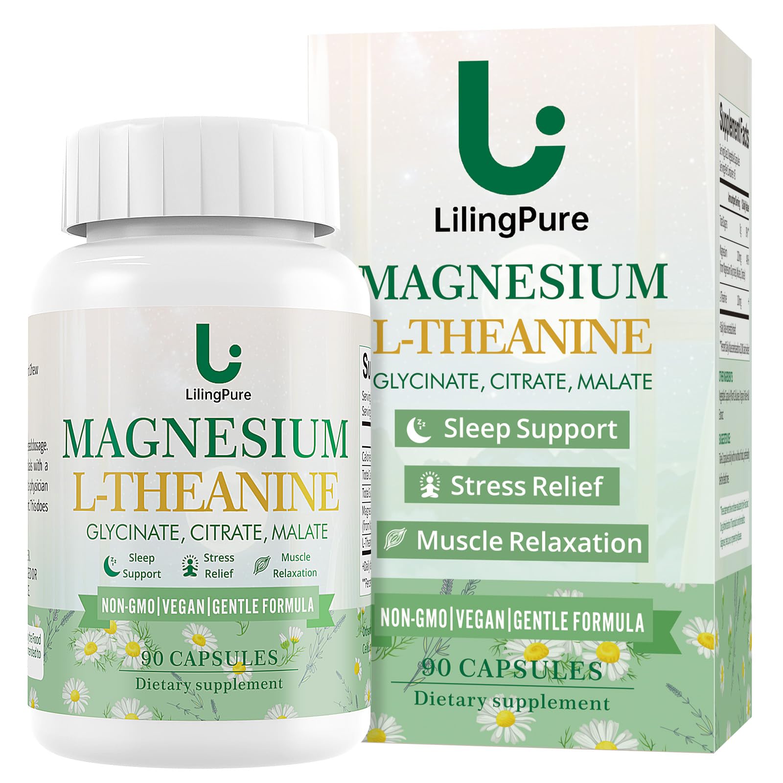 [USA MADE THIRD-PARTY TESTED]cGMP certified facilities, rigorous purity testing. Vegan, Non-GMO, gluten-free, no artificial fillers. Clean ingredients you can trust for daily wellness support. [45-DAY VALUE SUPPLY]90 capsules 45-day supply at 2 capsules daily. More economical than buying separate magnesium and L-Theanine supplements. Better value than typical 30-day bottles. [HIGH ABSORPTION MAGNESIUM FORMS]Three chelated magnesium types for maximum effectiveness: Glycinate (gentle on stomach), Malate (energy support), Citrate (optimal absorption). Superior to cheap magnesium oxide that causes digestive upset. [FAST-ACTING STRESS SLEEP SUPPORT]Feel calm within 20-30 minutes. Perfect for work stress, post-workout recovery, or bedtime relaxation. Non-drowsy formula keeps you alert during the day, naturally sleepy at night. Safe for daily use. [TRIPLE MAGNESIUM COMPLEX WITH L-THEANINE]200mg magnesium glycinate, malate citrate 100mg L-Theanine for complete stress relief. Magnesium relaxes muscles while L-Theanine calms racing minds without drowsiness. One formula addresses both [physical tension and mental stress.].