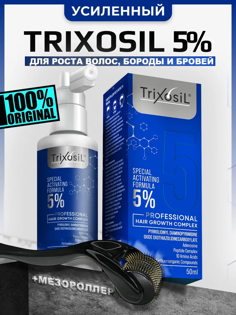 Оригинальный Trixosil 5% + мезороллер - мощное профессиональное средство, которое активно стимулирует рост волос на голове, бороде и усах (усовершенствованный аналог миноксидилла ). Не имеет аналогов! БЕЗ СИНДРОМА ОТМЕНЫ. Для мужчин и женщин.