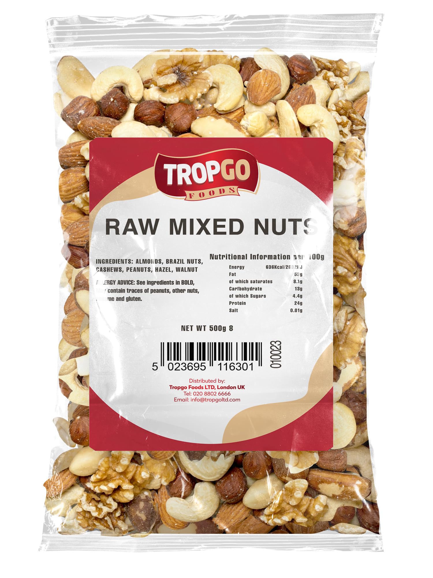 Tropgo Raw Mixed Nuts - 500g Ongezouten Notenmix - Vers Verpakt, Gezonde Noten met Vezels, Proteïne, Mineralen - Perfect als Snack - Bevat Amandelen, Paranoten, Cashewnoten, Pinda's, Hazelnoten