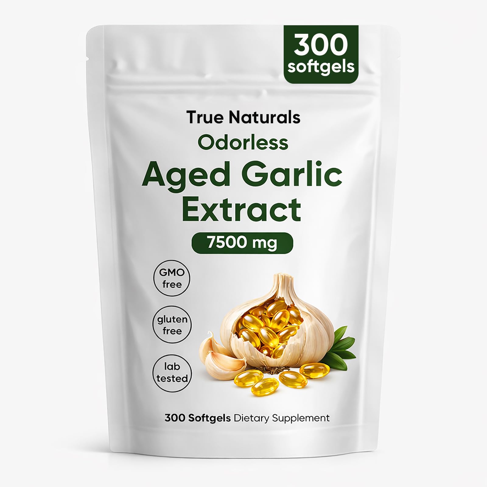 TRUE NATURALS Aged Garlic Extract - 300 Softgels 7500mg Odorless Organic Garlic Supplement 2-Year Matured for Heart Immune & Antioxidant Support Non-GMO Gluten Free Vegetarian (1)