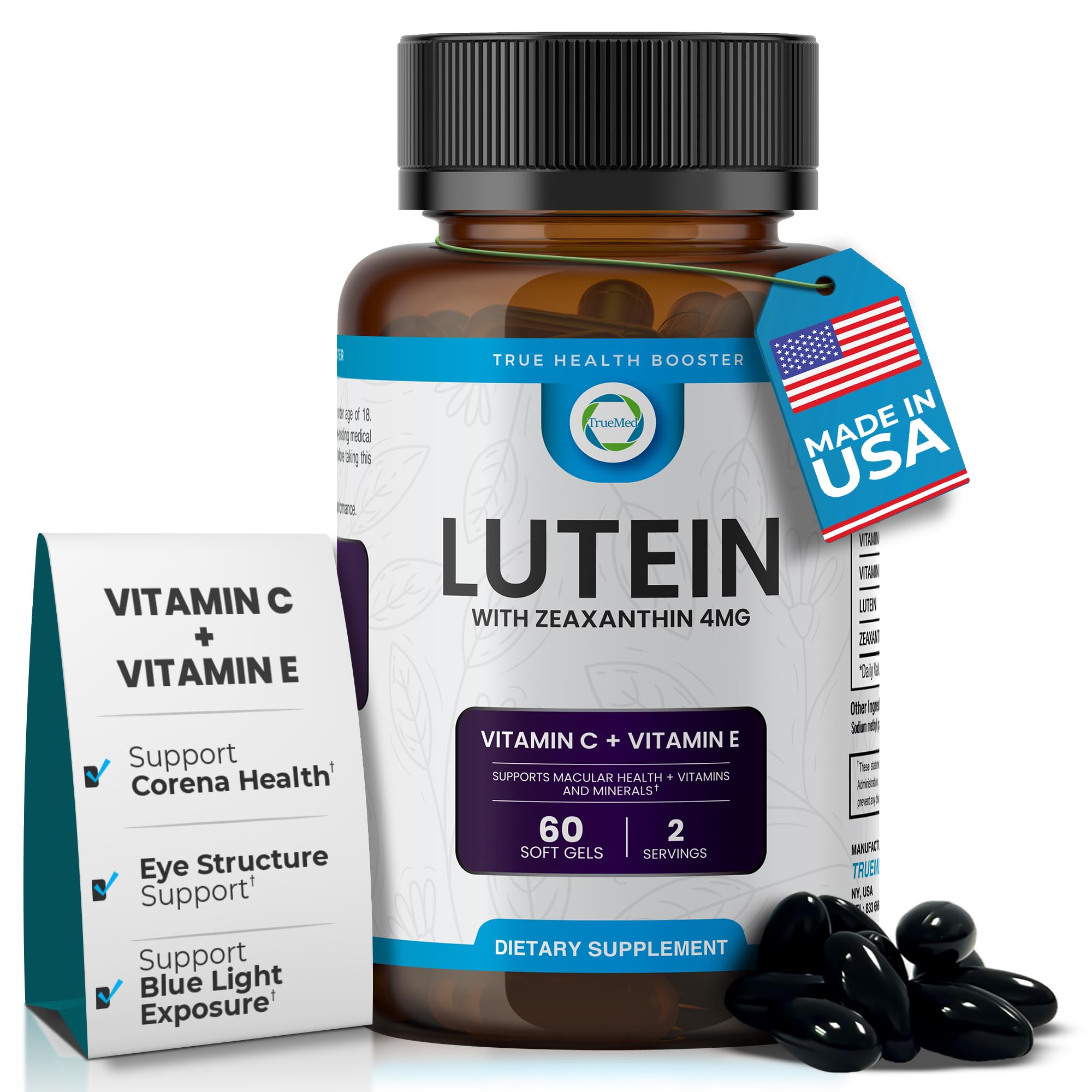 TRUEMED Lutein Vitamin C + Vitamin E 20mg Lutein with 4mg Zeaxanthin Eye Health Support Blue Light & UV Protection Supports Macular & Retinal Function 60 Softgels USA Made GMP Certified