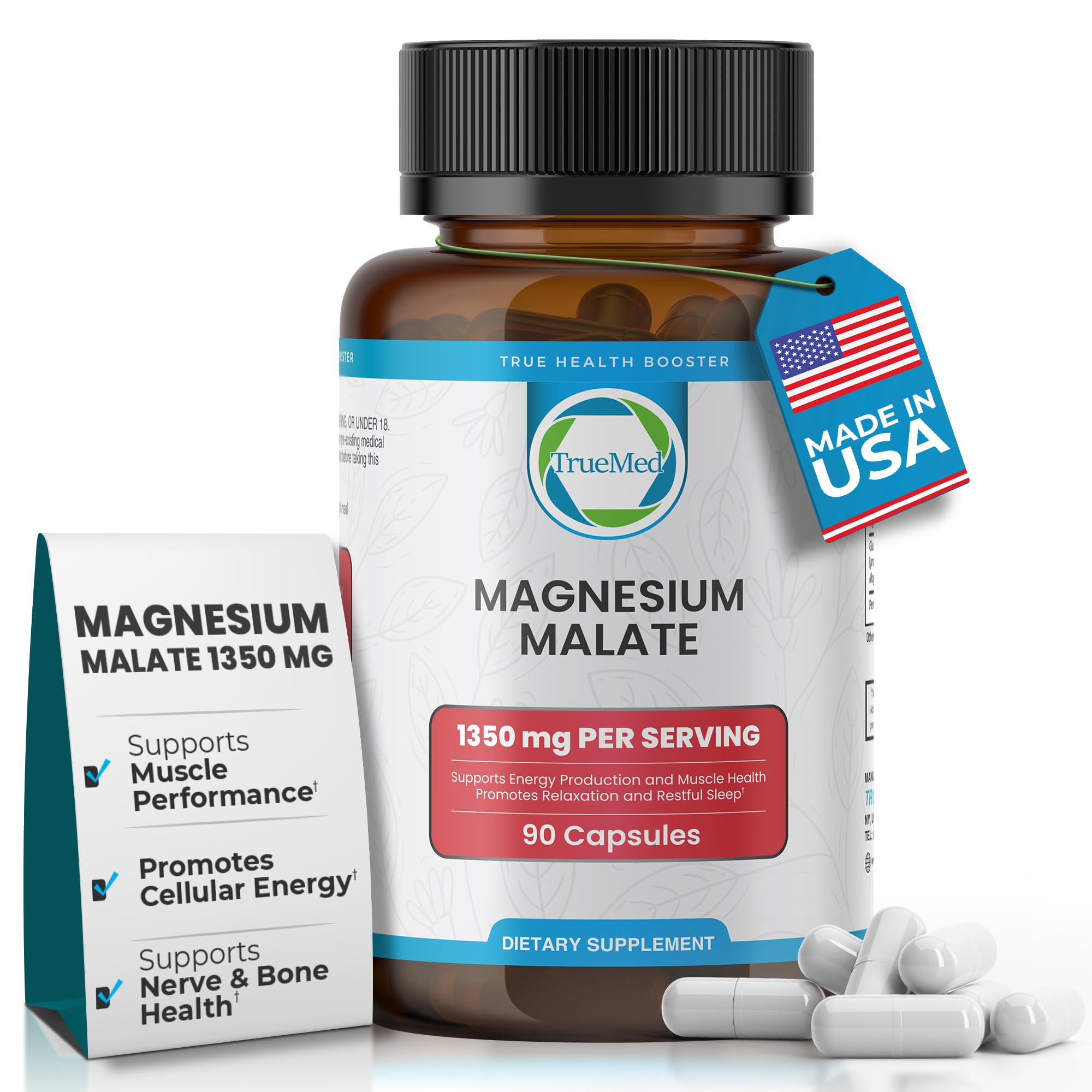 Truemed Magnesium Malate Capsules 1350mg High Bioavailability Magnesium Supplement for Muscle Function, Energy & Metabolic Support, Vegan, Non-GMO, Made in USA - 90 Capsules