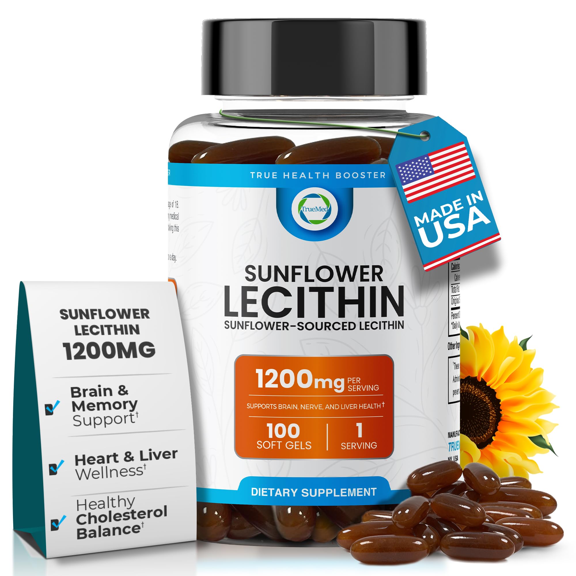 - : TRUEMED Sunflower Lecithin softgels are manufactured in a GMP-certified facility in the USA with strict third-party testing. Every softgel undergoes careful quality checks to ensure purity, potency, and consistency.TrueMed always reflect a premium, trustworthy supplement you can depend on. - : Each bottle contains 100 softgels, delivering a 100-day supply of TRUEMED Lecithin Supplement 1200mg for steady, convenient intake. Designed for smooth daily use, offering a simple way to include sunflower lecithin in your wellness habits. : TRUEMED Lecithin softgels designed to complement a balanced lifestyle and supporting fat metabolism. This thoughtful formulation promotes balance in energy levels and simple addition to balanced daily routines. Our Sunflower Lecithin provides clean, plant-based liver support. : TRUEMED delivers Lecithin 1200 mg per softgel supports overall cellular structure and communication. Our gentle formula helps maintain long-term nerve health and functional vitality and also ensure consistent support for daily nerve wellness. : TRUEMED Lecithin Supplement softgels provide phospholipid-rich support for general heart and circulatory wellness. By aiding healthy fat metabolism, our formula helps maintain heart function and steady energy levels, making it a daily addition for a mindful lifestyle while reinforcing cardiovascular support naturally. : Each softgel is designed to support overall brain wellness.TRUEMED Lecithin promotes clear thinking and enhanced cognitive performance with a naturally occurring phospholipid profile. Our Sunflower Lecithin helps maintain sharpness and mental clarity throughout the day. - : TRUEMED Sunflower Lecithin is naturally sourced to support cognitive and metabolic balance while avoiding soy and unnecessary additives. Gentle and allergen-free, it fits seamlessly into daily wellness routines, providing reliable, plant-based support for overall vitality. Our Lecithin 1200mg offers gentle daily nutritional support.