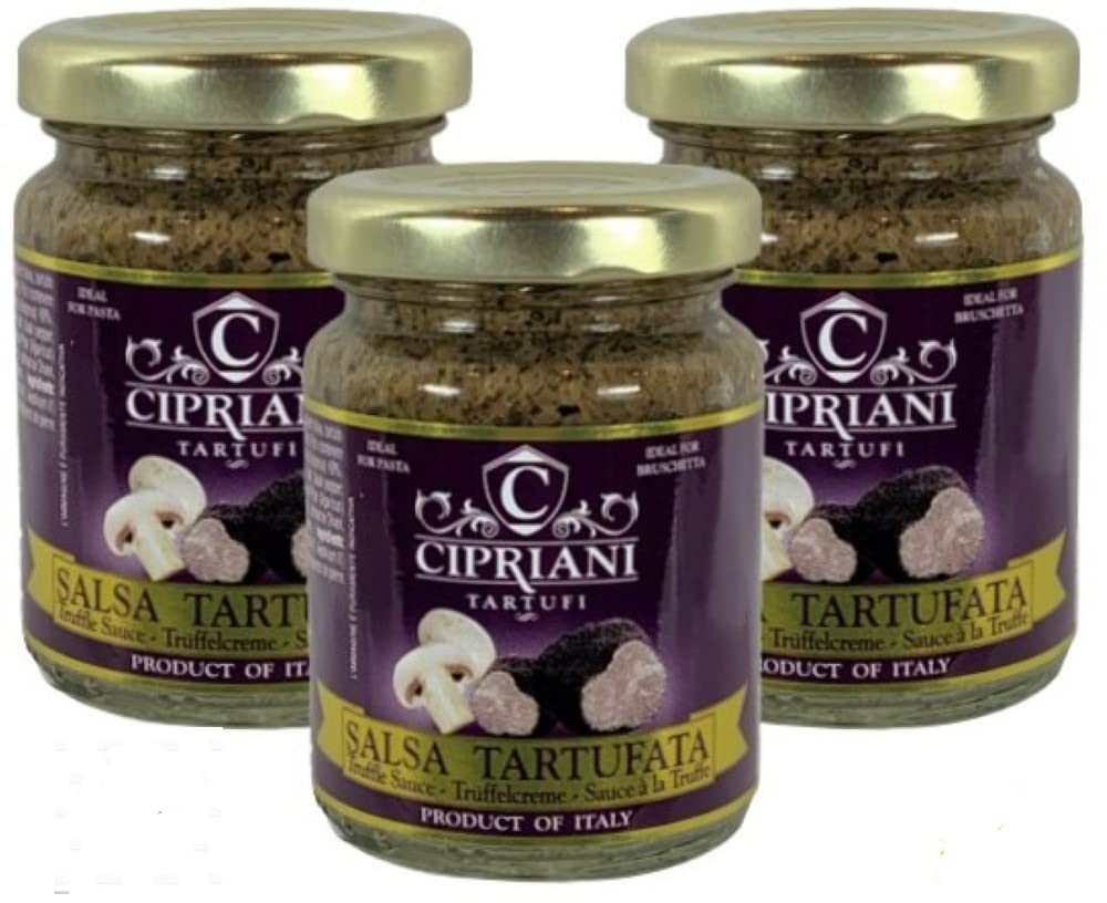 ALESSIO CIPRIANI, born in 1982, has been following in his father Mario's footsteps since childhood. He has also followed in those of his relative, Cesidio. A life dedicated solely and exclusively to the search for truffles. Passions and secrets that the truffle world has to offer, experiences and stories on how to recognize true quality. Alessio cherished it, so he made his dream come true. Cipriani Tartufi. Not just fresh truffles, so he completes his laboratory, to produce products with quality truffles. 3 jars of 80g of truffle sauce, 100 produced in Italy, from an artisanal production. Rustic condiment, finely ground, sweet and tasty.Store in a cool, dry place away from heat sources. After opening, cover with oil and refrigerate at 5 and consume within 20 days. Cipriani Truffle Sauce, allergen-free, suitable for celiacs, is a Vegan Food and GMO product. It does not contain colorings, preservatives or acidifiers, only natural products. Button mushrooms and 5 truffle, an excellent combination for a perfect truffle sauce to enhance your dishes, just like the chefs. Spreadable cream made from truffles and extra virgin olive oil, ready to use, ideal for bruschetta (warm bread, spread as desired). For pasta, melt a spoonful of butter, add 2 teaspoons of Cipriani Truffle Sauce for 100g of pasta, mix and serve hot. As a second course, serve directly on meat or even fish. Salad? . Of course, green salad, Parmesan shavings, salt, extra oil, and salsa. Three 80g jars of truffle sauce, 100 produced in Italy, from artisanal production. A rustic, finely ground, mild, and flavorful condiment. Suitable for vegans, vegetarians, and those with gluten intolerance. ALESSIO CIPRIANI, né en 1982, suit les traces de son père Mario depuis son enfance. Il a également suivi ceux du parent, Cesidio. Une vie dédiée uniquement et exclusivement à la recherche de la truffe. Passions et secrets que le monde de la truffe a à vendre, expériences et histoires sur la façon de reconnaître la vraie qualité. Alessio l'a chéri, alors il réalise son rêve. Cipriani Tartufi. Pas seulement des truffes fraîches, il complète donc son laboratoire, pour fabriquer des produits avec des truffes de qualité. 3 pots de 80 g de sauce à la truffe, 100 produite en Italie, issue d'une production artisanale. Condiment rustique, finement moulu, doux et savoureux.Conserver dans un endroit frais et sec à l'écart des sources de chaleur. Après ouverture, recouvrir d'huile et réfrigérer à 5 et consommer dans les 20 jours. La sauce aux truffes Cipriani, sans allergènes, convient à la consommation par les coeliaques, est un produit Vegan Food et OGM. Il ne contient pas de colorants, de conservateurs et d'acidifiants, uniquement des produits naturels. Champignons de Paris et 5 de truffe, une excellente association pour une parfaite sauce à la truffe pour sublimer vos plats, à l'image des chefs. Crème à tartiner à base de truffes et d'huile d'olive extra vierge, prête à l'emploi, idéale pour la bruschetta (pain chaud, à tartiner à volonté), Pour les pâtes, faire fondre une cuillerée de beurre, ajouter 2 cuillères à café de Sauce à la Truffe Cipriani pour 100 g de pâtes, mélanger et servir chaud. En deuxième plat, au choix, directement sur de la viande ou même du poisson. Salade? . Bien sûr, salade verte, copeaux de parmesan, sel, huile supplémentaire et salsa. 3 pots de 80 g de sauce à la truffe, 100 produite en Italie, issue d'une production artisanale. Condiment rustique, finement moulu, doux et savoureux. Produit adapté aux végétaliens, végétariens et intolérants au gluten.