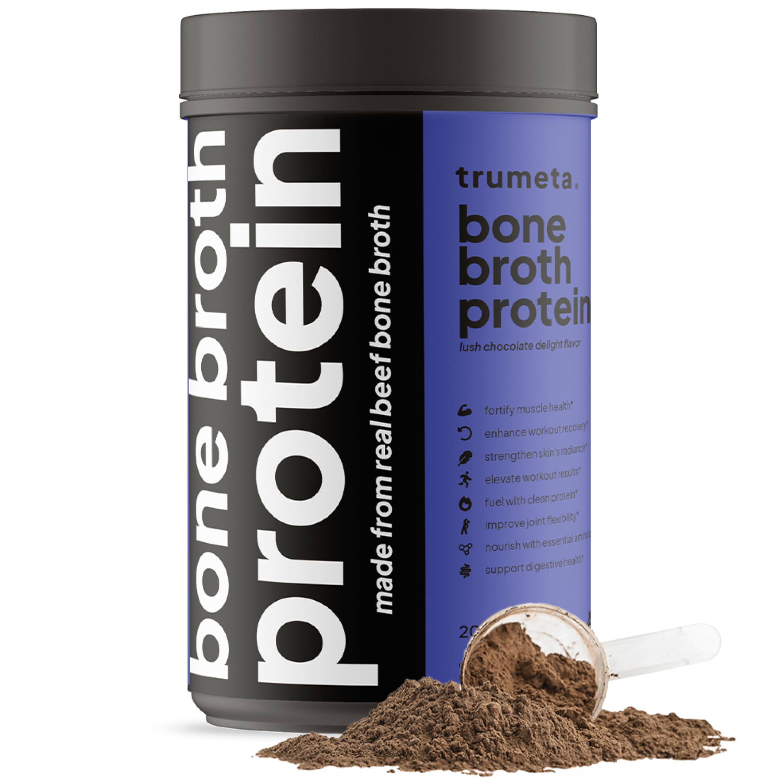 Comprehensive Health Support - Comprehensive Nutritional Support - trumeta collagen powder features a rich blend of 9 amino acids and 98 pure bone broth powder. Manufactured in the USA using foreign and local ingredients while being crafted for a balanced diet. Ideal For All Ages - Our bone broth supplements are designed for athletes seeking optimal performance, as well as seniors focused on long-term health maintenance. This versatile supplement is designed to complement your daily nutrition at any stage of life. Nutritious and Versatile Supplement - This high protein bone broth powder for humans offers a nutritious addition to your daily routine. Ideal for shakes, meals, or as a unique cooking ingredient, it's the versatile choice for a nutritious lifestyle. Luxurious Chocolate Taste - Discover the irresistible chocolate taste of our bone protein powder. This deliciously nutritious powder satisfies your chocolate cravings and adds a rich dimension to your diet. Beef Bone Collagen - Experience trumeta Bone broth collagen powder, made from selected beef bones for unparalleled purity. This collagen supplement is designed to complement your daily nutritional intake with every nutrient-packed scoop.