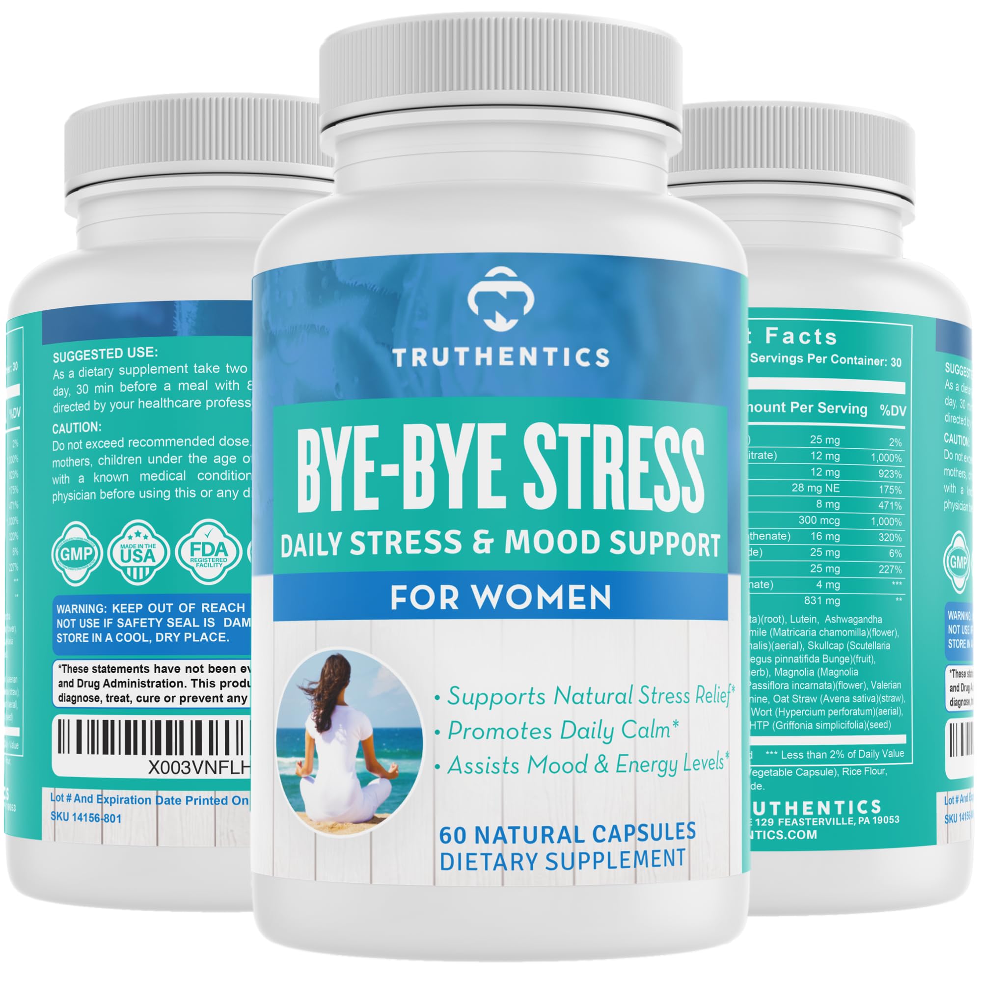 Made in the USA Third-Party Tested: Expertly crafted in the USA at an NSF GMP-certified facility and third-party lab tested for potency and purity to ensure high-quality supplements you can trust. Easy-To-Swallow, Clean Formula: Carefully crafted stress support capsules made with non-GMO, sugar free, gluten free, and vegan-friendly ingredients free from additives or artificial coloring includes 60 capsules per bottle (30-day supply). Focus Daily Energy Support: Women's stress support formula made with herbs and nutrients tradionally used to support focus, mental clarity, and daily energy includes 5-HTP, GABA, Ashwagandha, Rhodiola, Bacopa, Lemon Balm, and Passion Flower. Supports Calm Emotional Balance: Stress support vitamins for women with B complex vitamins (B1, B2, B3, B5, B6, and Biotin) plus magnesium, traditionally used to support relaxation and help maintain a calm, balanced state throughout the day. Daily Stress Mood Support for Women: Bye Bye Stress is a sugar free supplement formulated with botanicals, vitamins, and nutrients designed to support calmness, relaxation, energy, and mood as part of a balanced lifestyle includes Ashwagandha, Rhodiola, GABA, L-Theanine, Valerian Root, and Chamomile.