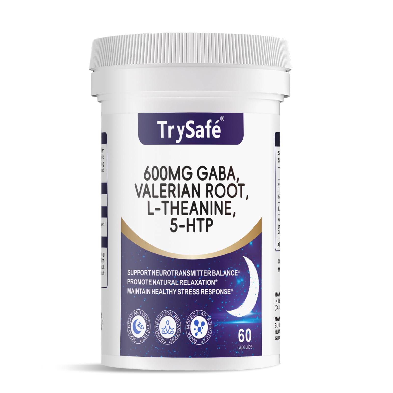 Supports Serotonin-Melatonin Pathway : 5-HTP serves as a direct precursor to serotonin, which helps regulate mood and sleep-wake cycles, and further converts to melatonin - your body's natural sleep-regulating hormone. . Promotes Relaxed Alertness : L-Theanine helps stimulate alpha brain waves associated with relaxed alertness, while supporting healthy levels of GABA and serotonin - working together with GABA to maintain calm focus and restful sleep. . Enhances GABA's Calming Effects : Valerian Root works by supporting GABA metabolism and receptor function in the nervous system, helping to enhance GABA's natural calming properties and promote deeper relaxation. . Brain's Natural Calming Signal : GABA (Gamma-Aminobutyric Acid) acts as the primary inhibitory neurotransmitter in your brain, helping to calm neural activity, reduce neuronal excitability, and support natural relaxation for better sleep quality. . Advanced Neuro-Relaxation Synergy : TrySafe innovative formula combines 600mg GABA, Valerian Root, L-Theanine, and 5-HTP to work synergistically in supporting your body's natural sleep-wake cycle and promoting restful sleep. .