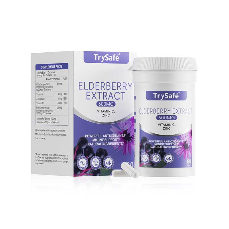 TrySafe 900mg Elderberry Immune Support Supplement 5-in-1 Formula with 10:1 Concentrated Extraction 600mg Elderberry Extract 200mg Echinacea Extract 60mg Zinc 40mg VC + VD Support Immune System*