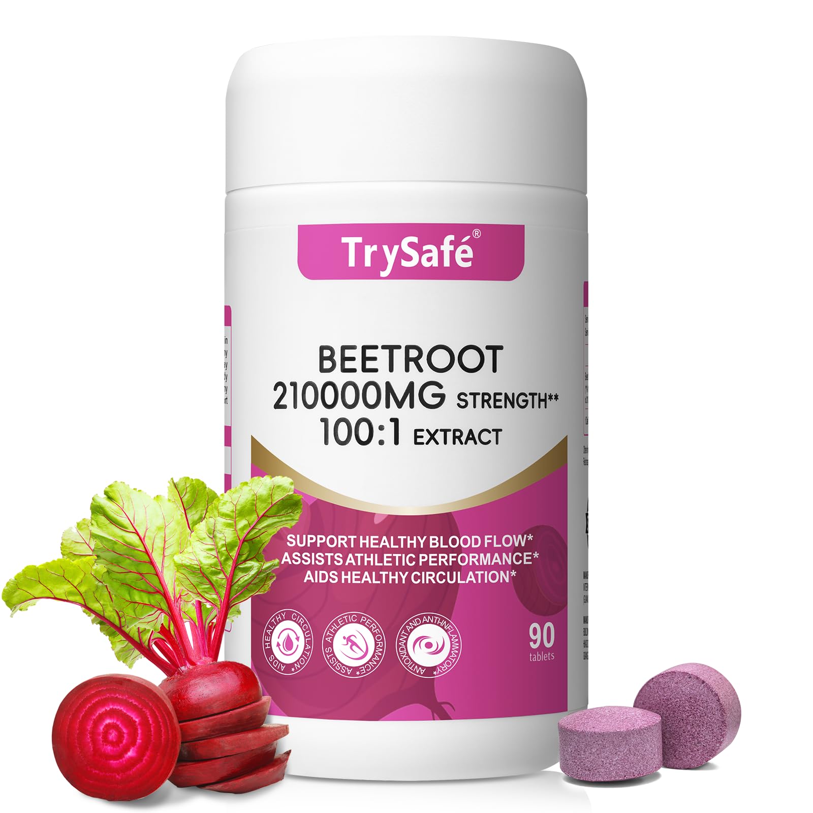 TrySafe Organic Beet Root 210000 mg Strength 100:1 Extract to Boost Daily Nutrition, Supports healthy blood circulation and enhances athletic performance , Vegan, Non-GMO, 90 tablets, 30-Day Supply