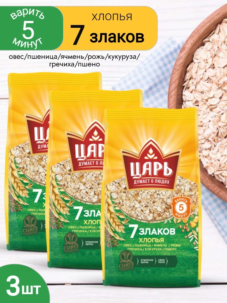 Хлопья "Царь" 7 злаков состоят из овсяных, пшеничных, ячменных, ржаных, гречневых, кукурузных и рисовых хлопьев