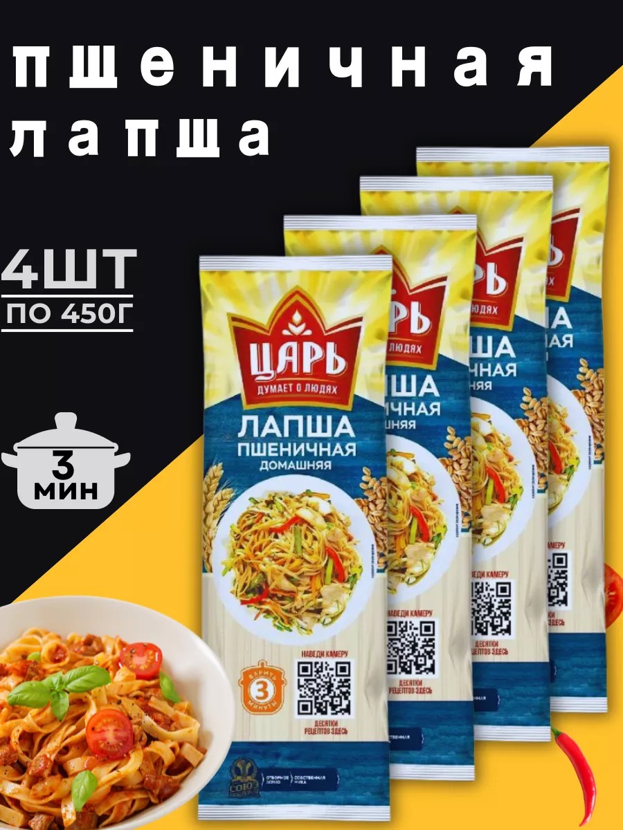 Пшеничная лапша Царь станет отличным гарниром для любых блюд, подойдет для приготовления супов и гарниров.Лапша домашняя - одно из популярных блюд домашней кухни. Изготовлена из муки высокого качества при комнатной температуре, что позволило сохранить питательные свойства и пользу пшеницы. Макаронные изделия содержат большое количество клетчатки и белка. Очень питательны и полезны. Прекрасно подходят в качестве гарнира к мясу и рыбе. Благодаря пшенице твердых сортов макароны прекрасно сохраняют форму и вкусовые свойства при варке.Лапша твердых сортов пшеницы не развариваются и готовятся быстро.Этот продукт отлично подходит для пасты,для супов и гарниров,а так же для блюд азиатской кухни.Благодаря 100% натуральному составу,является безопасным для детского меню.