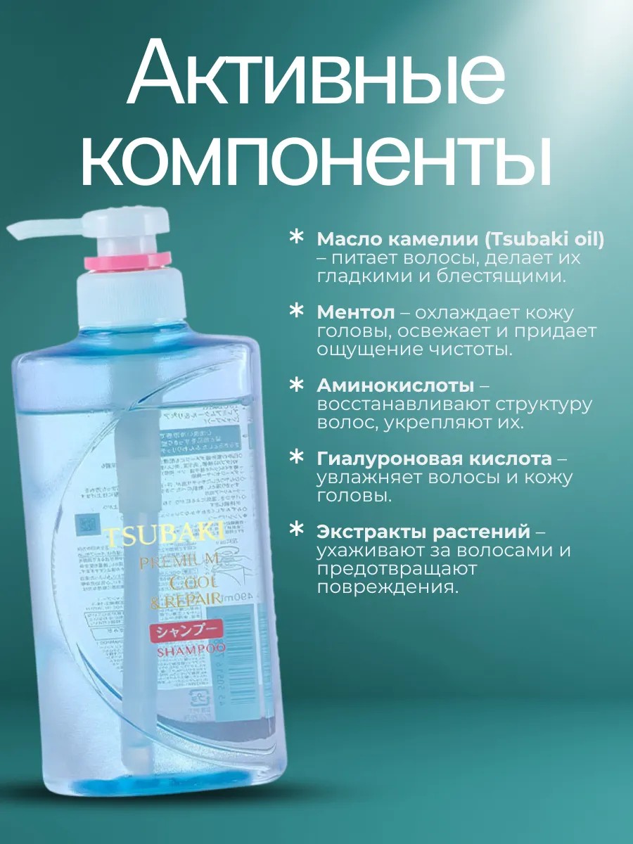Шампунь для волос женский Tsubaki Premium COOL Repair - восстанавливающий шампунь премиум-класса восстанавливает поврежденные волосы изнутри, делая их мягкими и послушными. Инновационная технология проникновения, вдохновленная технологиями салонного ухода, позволяет косметическим ингредиентам полностью проникать в сердцевину волос. Свежий, элегантный и великолепный цветочно-фруктовый аромат.