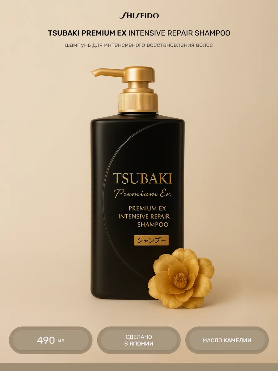 Погрузись в мир роскоши с шампунем Shiseido Tsubaki Premium EX Intensive Repair! Это не просто шампунь - это трехмерное лечение для повреждённых волос.