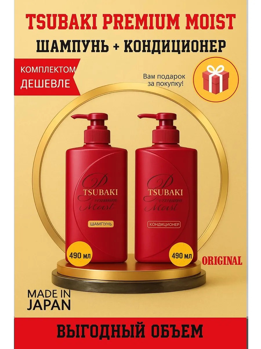 | Комплектация | Шампунь Tsubaki Premium Moist 490 мл + Кондиционер Tsubaki Premium Moist 490 мл; тканевая маска для лица в подарок |